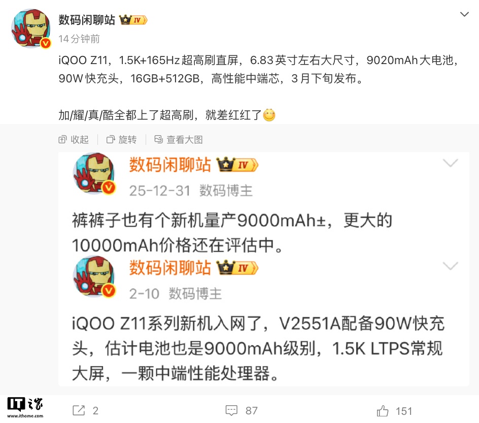 IT之家 3 月 9 日消息,博主 @数码闲聊站 发文,透露 iQOO Z11 将于本月下旬发布,该机搭载一块约 6.83 英寸大尺寸 1.5K 165Hz 超高刷直屏,搭载“高性能中端芯”,匹配 16GB RAM 和 512GB 存储空间,内置 9020mAh 大电池,配 90W 快充头。