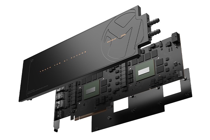 锐炫 Arc Pro B60 Dual 48G Liquid 由铭瑄与 abee 合作开发,其三维 300×110×20 (mm),厚度仅有 1 槽,两个 GPU 各提供 1 个 DisplayPort 2.1a UHBR20 和 1 个 HDMI 2.1a 接口。该卡整体功耗达 400W,而凭借液冷散热其满载温度低至 61℃。