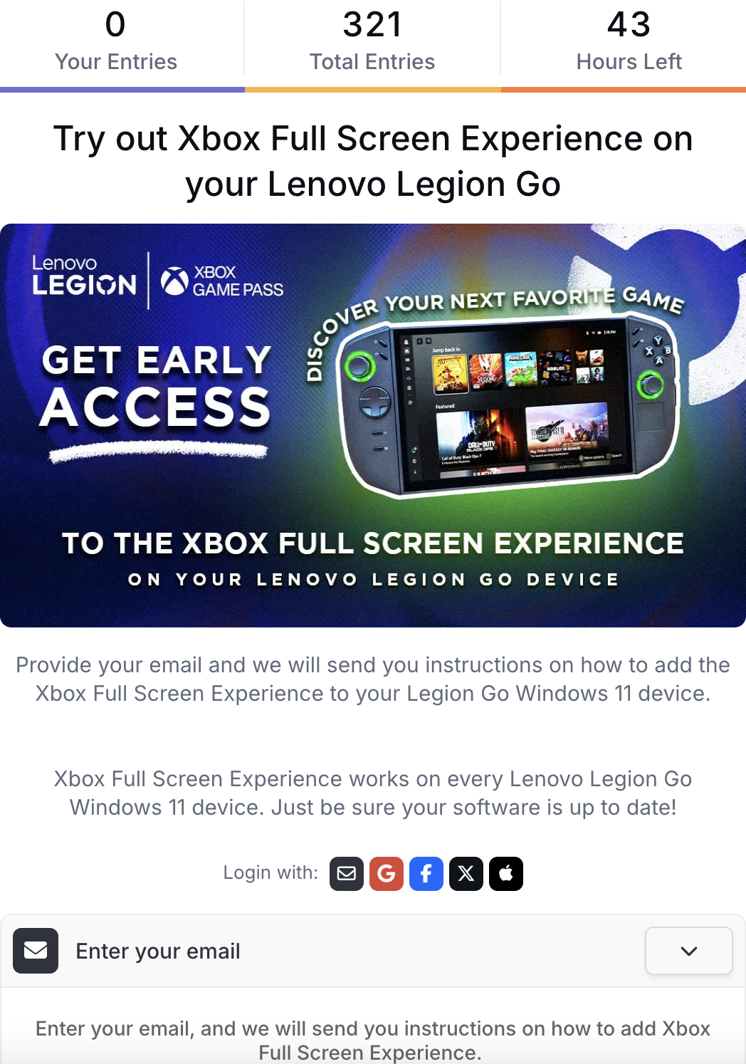 根据官方说明,早期测试支持 Legion Go 以及 Go 2 掌机,需要通过 Gleam 平台注册。用户需要在报名页面输入电子邮箱地址,若被选中则会发送 Xbox FSE 安装指南。