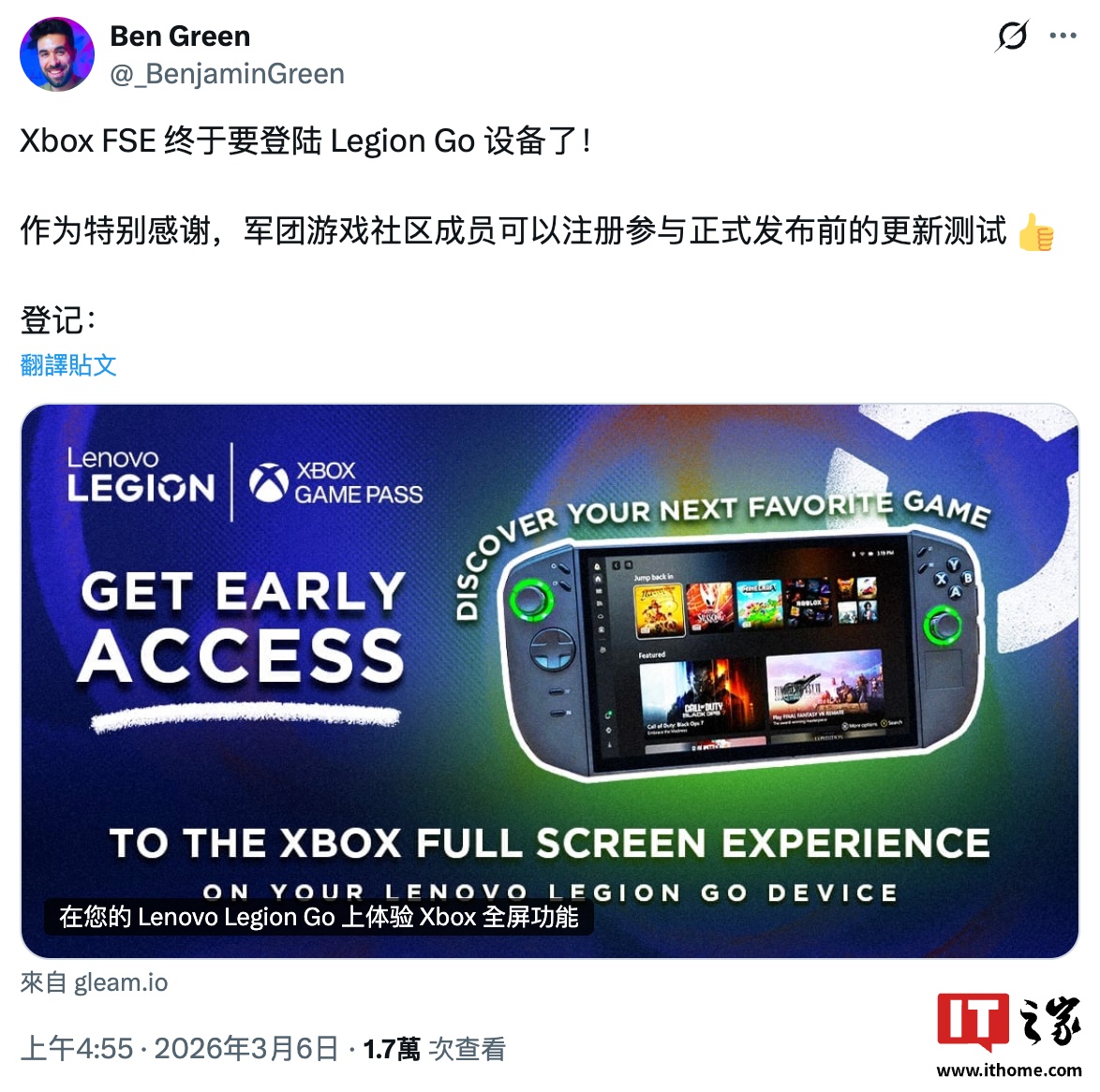 联想全球游戏高级经理 Ben Green 上周(IT之家注:3 月 6 日)在 X 平台发文称,Xbox FSE 全屏体验即将登陆 Legion Go 系列掌机。不过这一功能目前还在进行早期测试,还没有向所有用户开放。