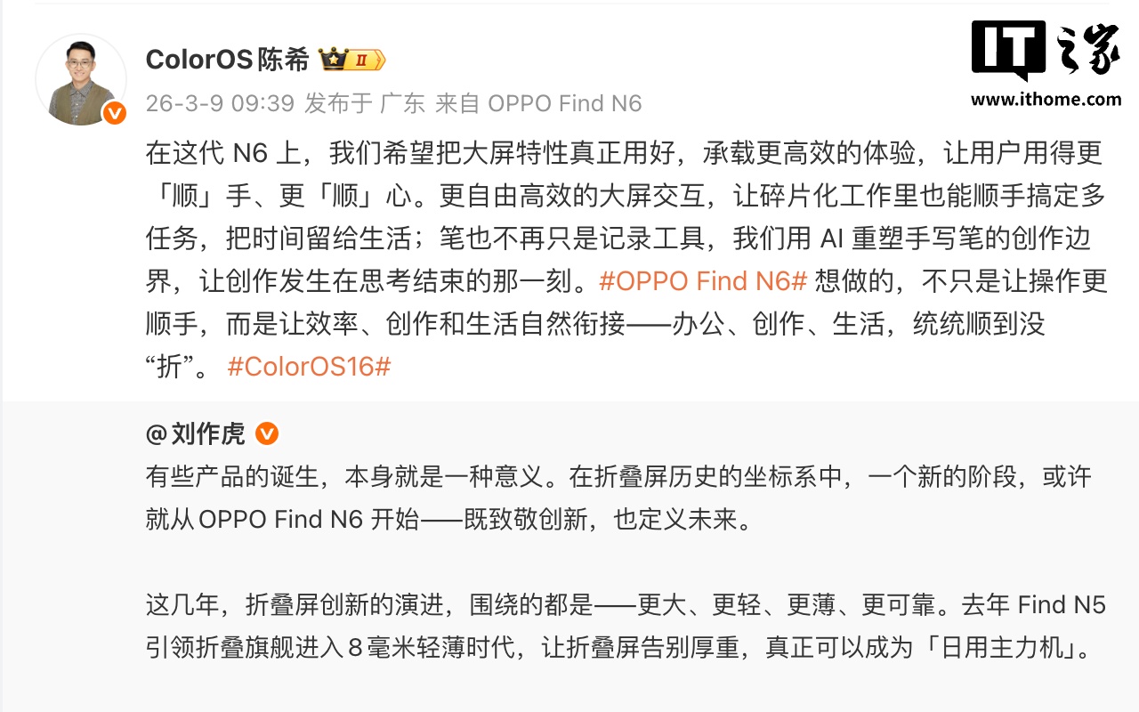 IT之家 3 月 9 日消息,今天上午,OPPO 首席产品官、一加创始人 @刘作虎 在微博发文详解 OPPO Find N6 折叠屏手机的设计思路。他直言:在折叠屏历史的坐标系中,一个新的阶段,或许就从 OPPO Find N6 开始 —— 既致敬创新,也定义未来。