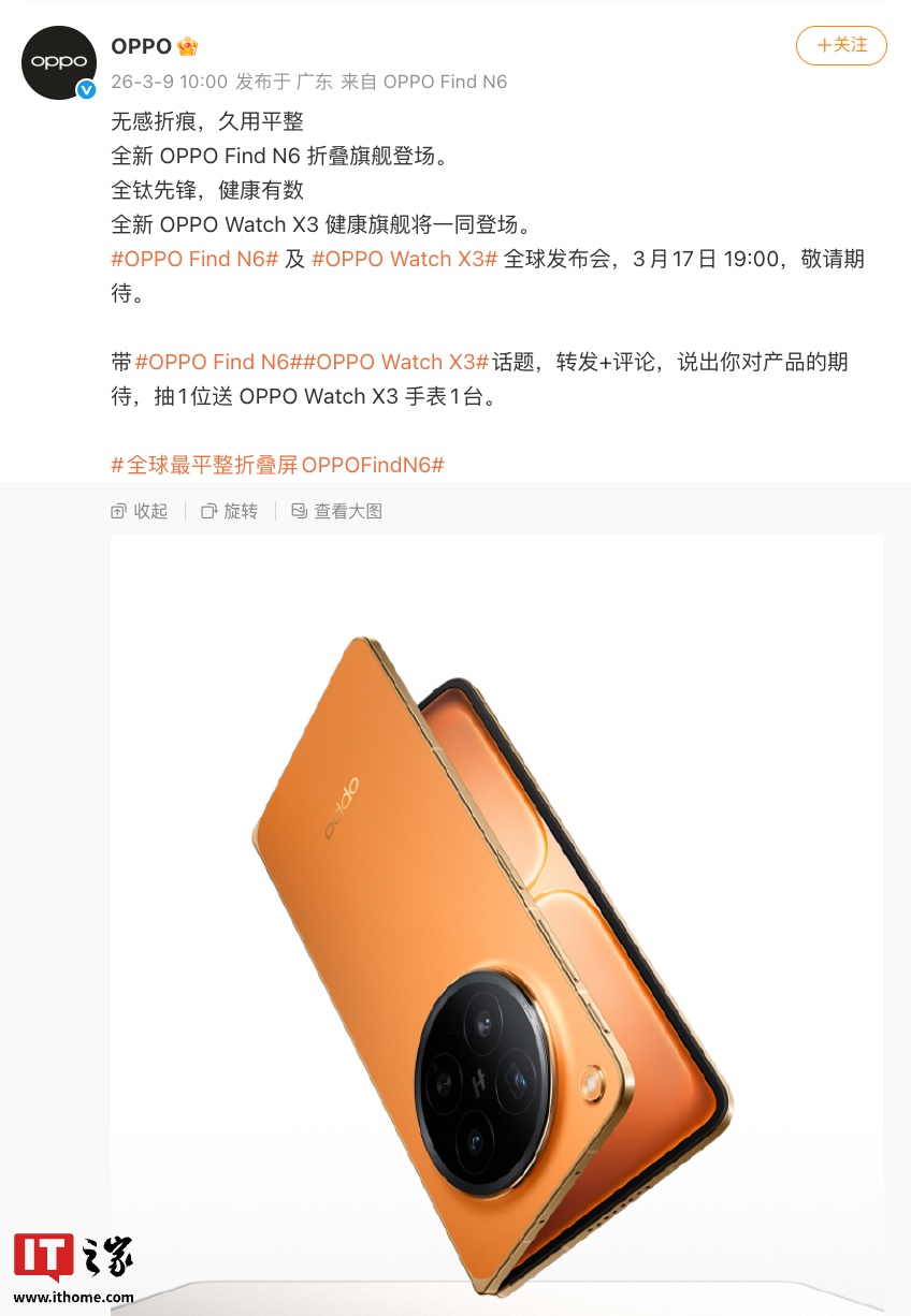 IT之家 3 月 9 日消息,OPPO 今天宣布 Watch X3 智能手表将于 3 月 17 日晚 19:00 发布,与 Find N6 大折叠同台登场,号称“健康旗舰”。