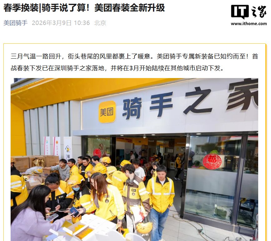 IT之家 3 月 9 日消息,据美团官方今日消息,美团外卖骑手服春装升级,已在深圳骑手之家落地下发,并将在 3 月开始陆续在其他城市启动下发。