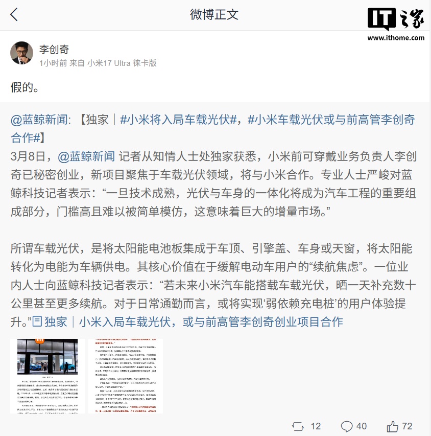 IT之家 3 月 9 日消息,据蓝鲸新闻 3 月 8 日报道,知情人士透露,小米前可穿戴业务负责人李创奇已秘密创业,新项目聚焦于车载光伏领域,将与小米合作。