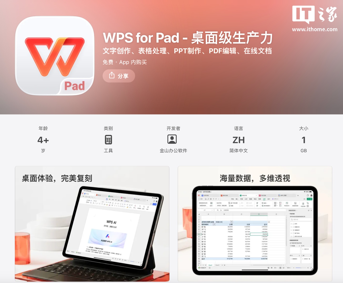 IT之家 3 月 9 日消息,金山 WPS for Pad 办公软件现已上架苹果 App Store 国区商店,以前没有抢到 TestFlight 测试资格的用户也可以下载,仅支持简体中文,需要 iPadOS 15.0 以上系统。