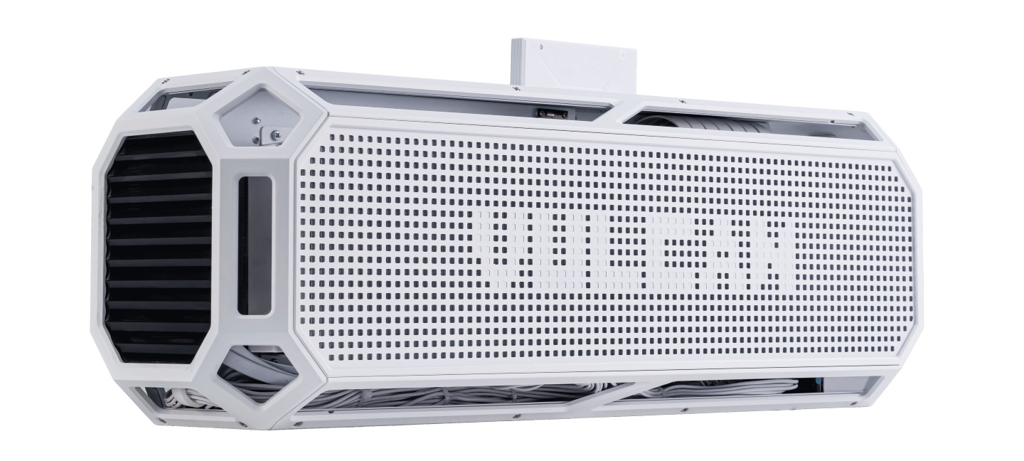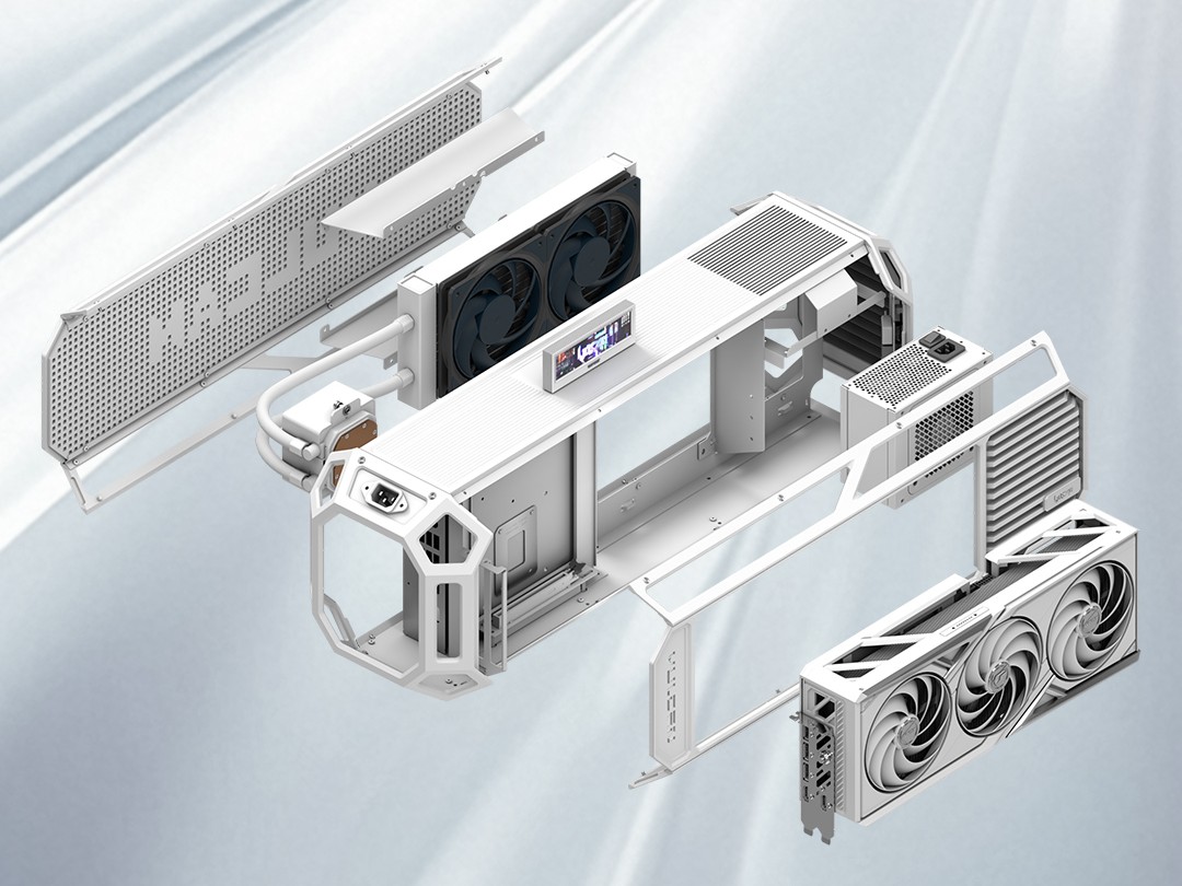 iGame LAB Vulcan Armor 整体采用横向布局设计,整机尺寸 617×186.6×210 (mm),机身为 CNC 工艺全铝合金材质,顶部拥有适配显卡随附“火神智屏”的磁吸触点底座,配备纯铝身份铭牌。