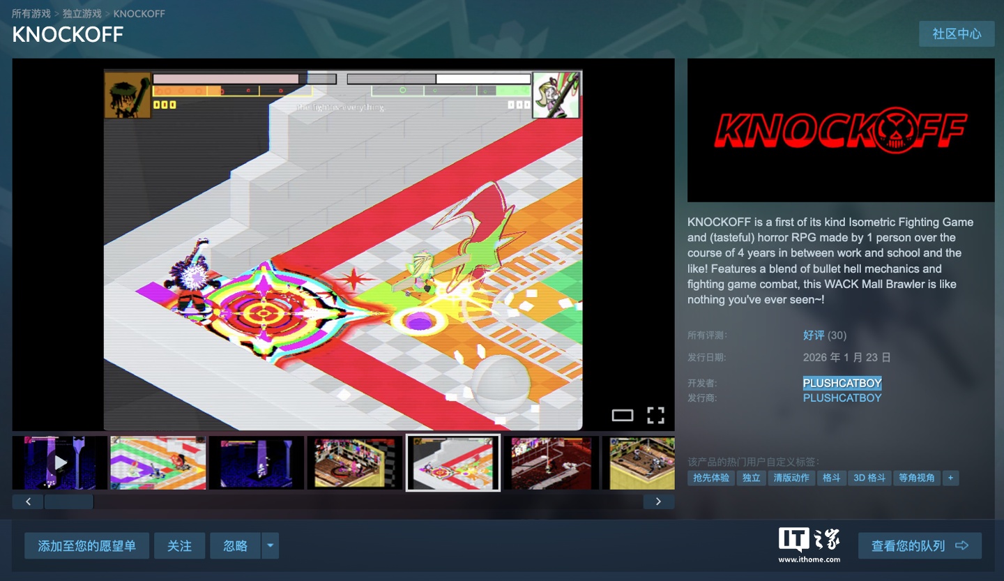 IT之家 3 月 9 日消息,开发商 PLUSHCATBOY 宣布旗下动作游戏《KNOCKOFF》近期将在 Steam 平台转为付费游戏,玩家可以限时将本作加入 Steam 库,以便继续免费游玩。IT之家附 Steam 商品页。