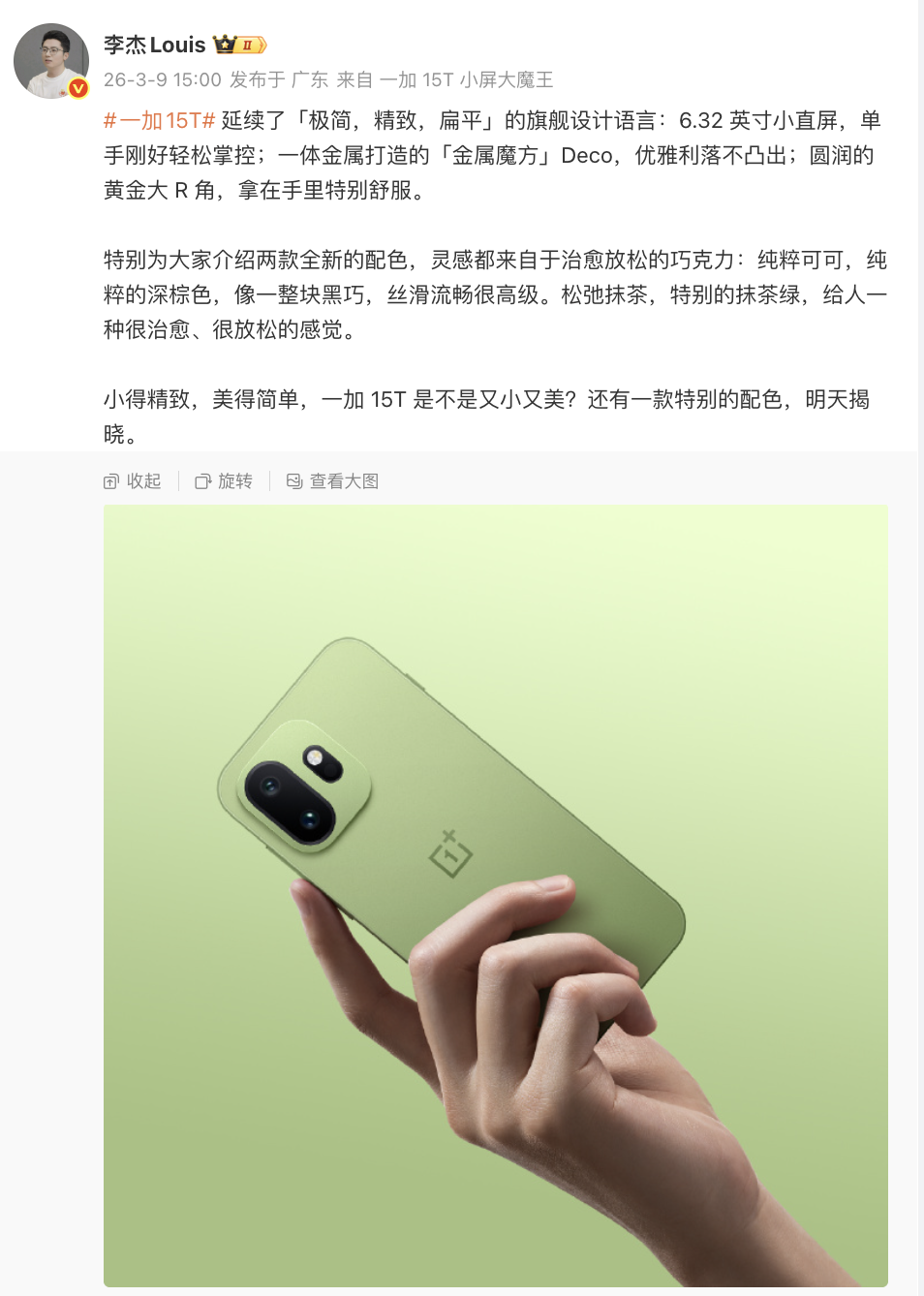 IT之家 3 月 9 日消息,一加中国区总裁李杰今天在微博发文,公布 15T 手机的两款配色「纯粹可可」「松弛抹茶」的官方图片。