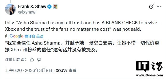 微软首席通讯官弗兰克 · 肖发文称:“‘阿莎 · 夏尔马得到我完全信任,并拥有重启 Xbox 与赢回玩家信任的无限额度支票,不计任何代价’—— 这句话我从未说过。”