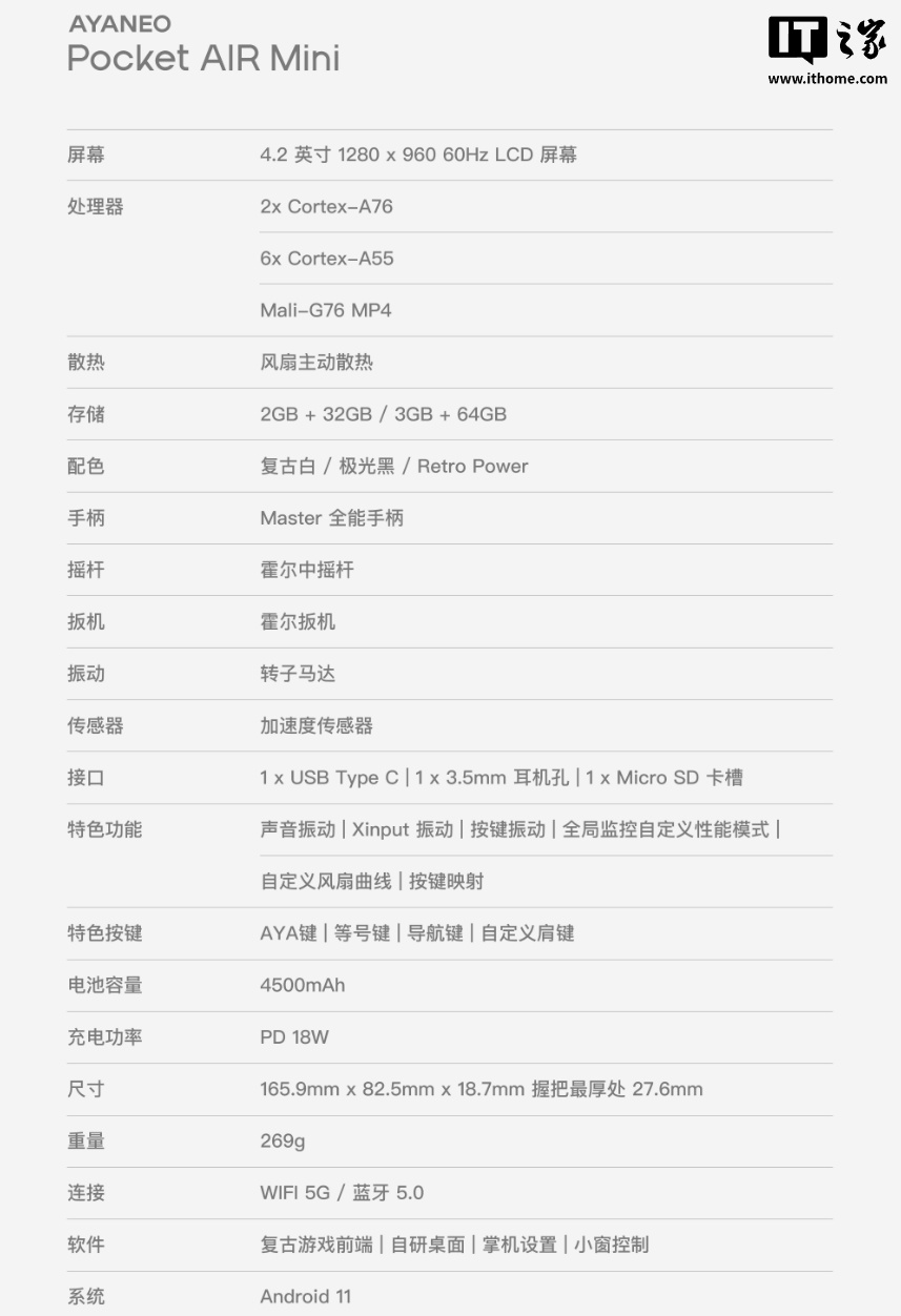 IT之家附 AYANEO Pocket AIR Mini 掌机参数如下:
