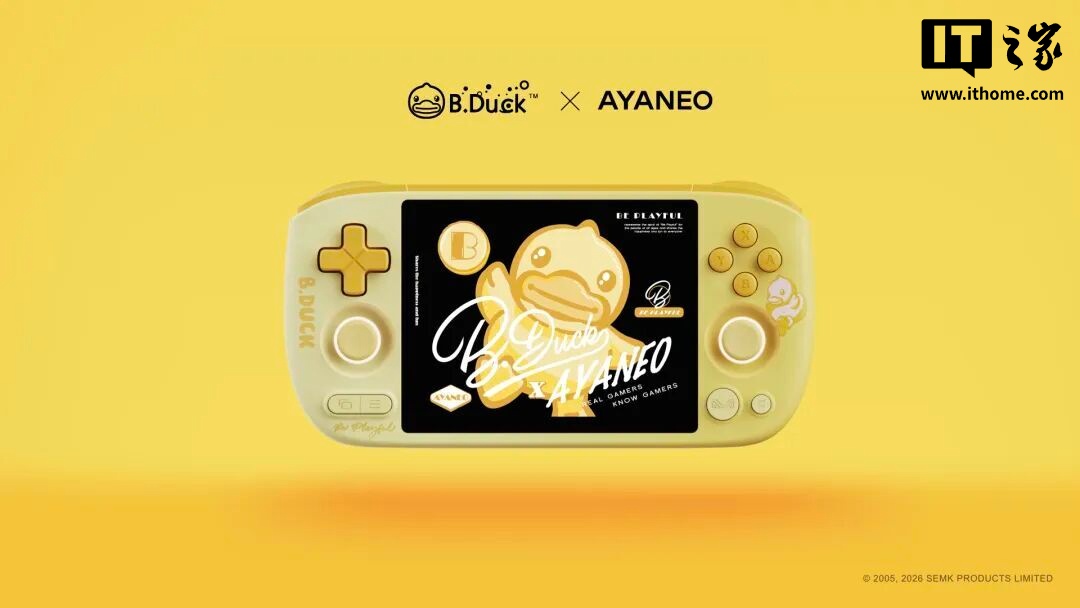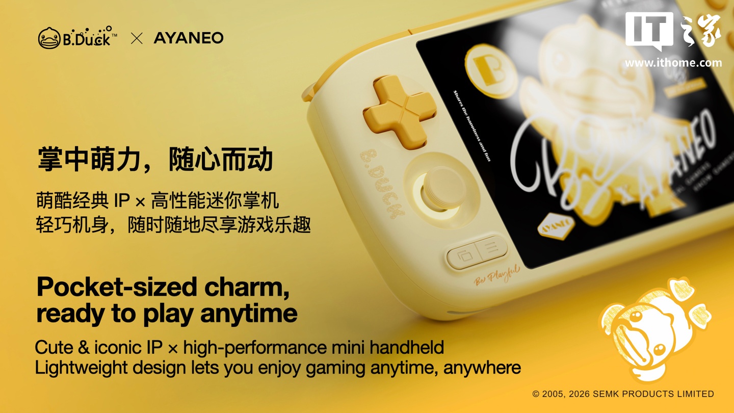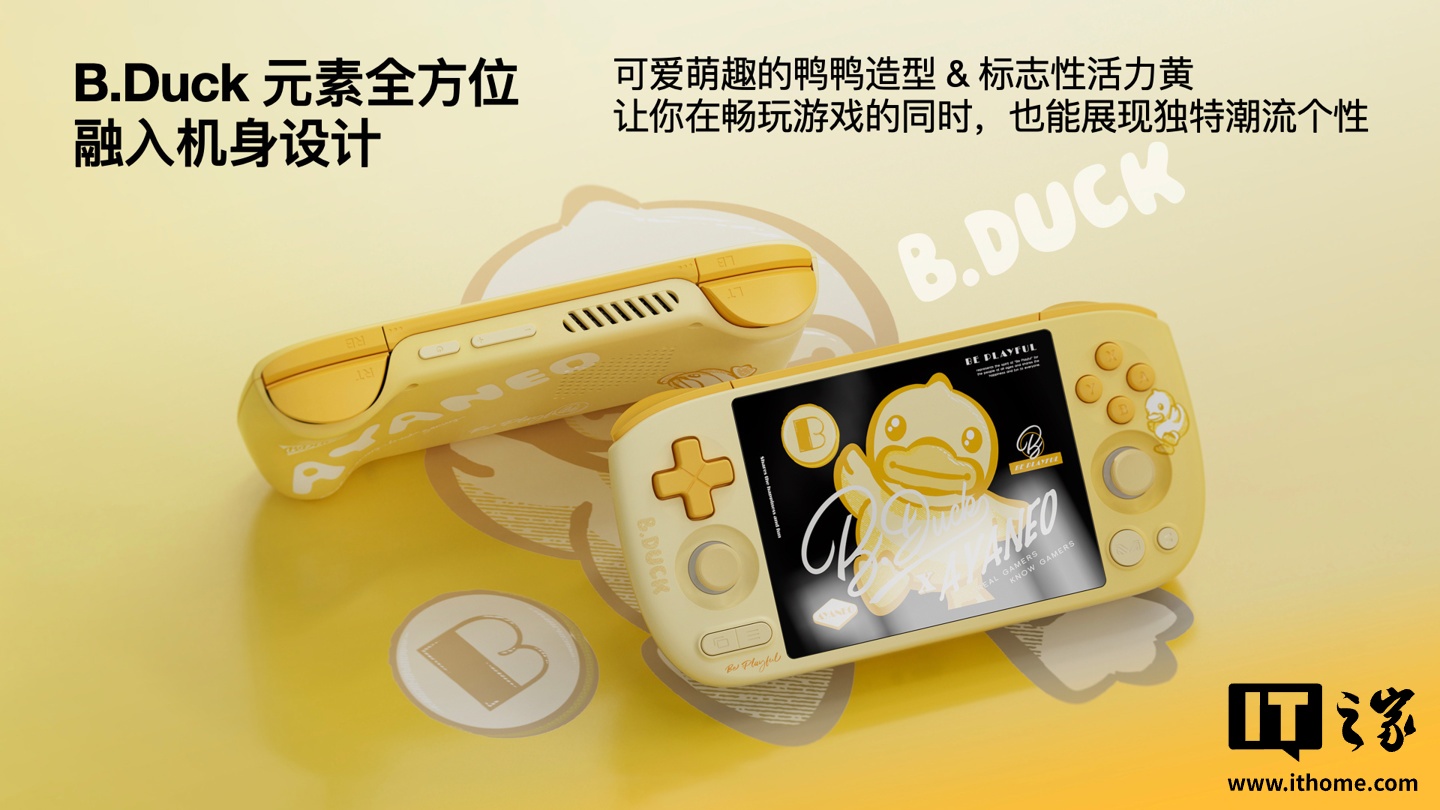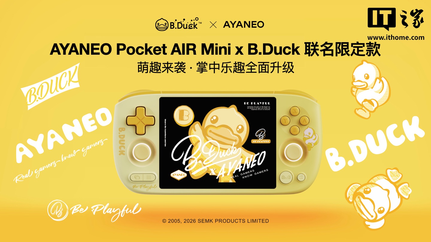 IT之家 3 月 9 日消息,AYANEO 官方宣布,AYANEO Pocket AIR Mini x B.Duck 小黄鸭联名限定款掌机现货发售,该机数量有限,3GB+64GB 预售价 799 元(京东显示到手价 774 元)。