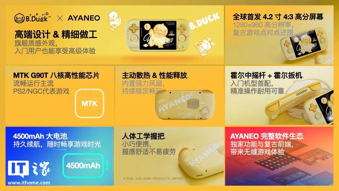 据介绍,AYANEO Pocket AIR Mini × B.Duck 联名限定款延续了小巧机身与人体工学设计,配备 4.2 英寸 4:3 比例屏幕,搭载联发科八核 G90T 芯片,并采用霍尔中摇杆与霍尔扳机。