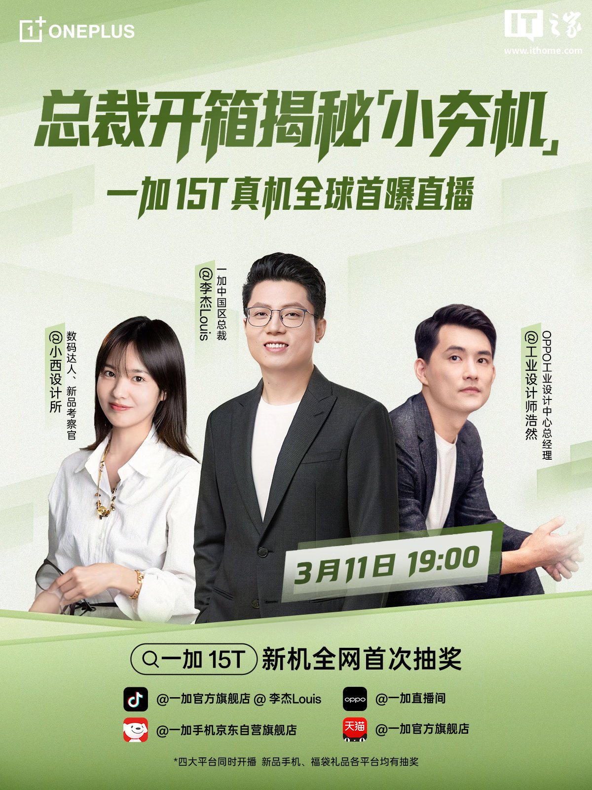 一加中国区总裁李杰今日宣布,将在 3 月 11 日 19 点举行一加 15T 真机全球首曝直播。届时,总裁将开箱揭秘「小夯机」,OPPO 工业设计中心总经理刘浩然也将在直播间现身。