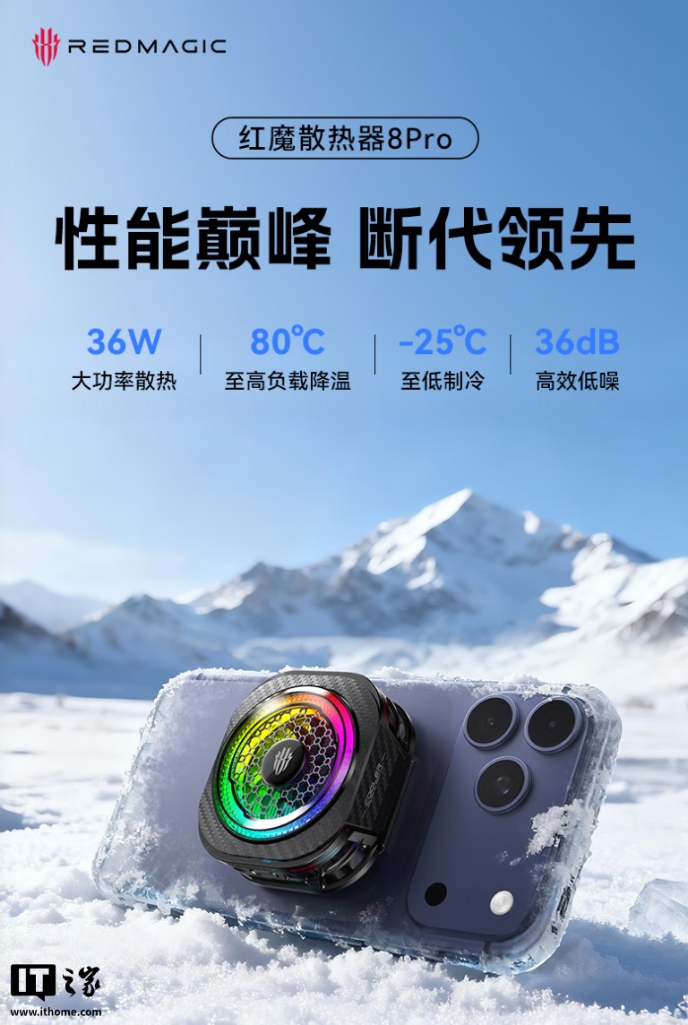IT之家注意到,红魔散热器 8 Pro 还支持 36W 大功率散热、80°C 至高负载降温、-25°C 至低制冷以及 36dB 高效低噪。可压制手机满帧率游戏持续发热,负载稳定控温,快速降低设备核心温度。