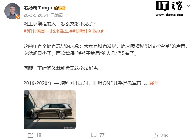 IT之家 3 月 10 日消息,理想汽车产品线负责人汤靖昨晚在微博发文,回顾了增程电动汽车技术自 2019 年至今的舆论变化,同时预告搭载理想第三代增程系统的 L9 Livis 将于今年第二季度正式发布。