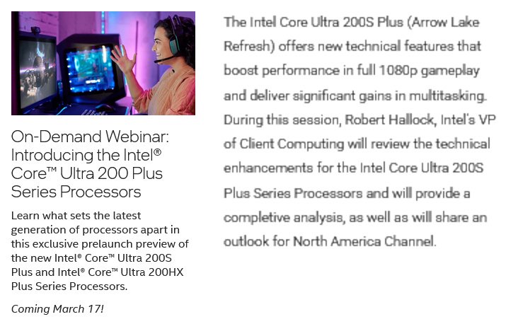 IT之家 3 月 10 日消息,根据消息人士 188号 (@momomo_us) 挖掘到的信息,英特尔将于 3 月 17 日举行酷睿 Ultra 200 Plus(IT之家注:代号 Arrow Lake Refresh)处理器的发布前网络研讨会,包含桌面端的酷睿 Ultra 200S Plus 和移动端的酷睿 Ultra 200HX Plus。