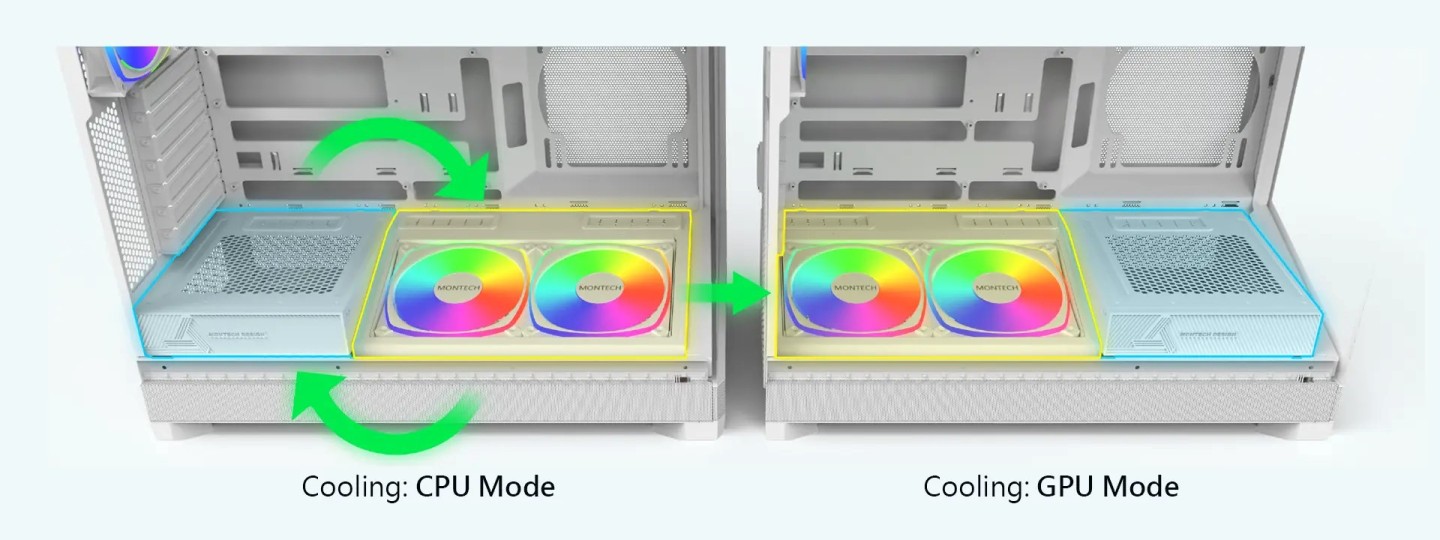而这款机箱最有特色的无疑是底部结构:电源舱模块与底部风扇支架模块可互换位置,让机箱风道在 CPU 模式和 GPU 模式间简易切换。