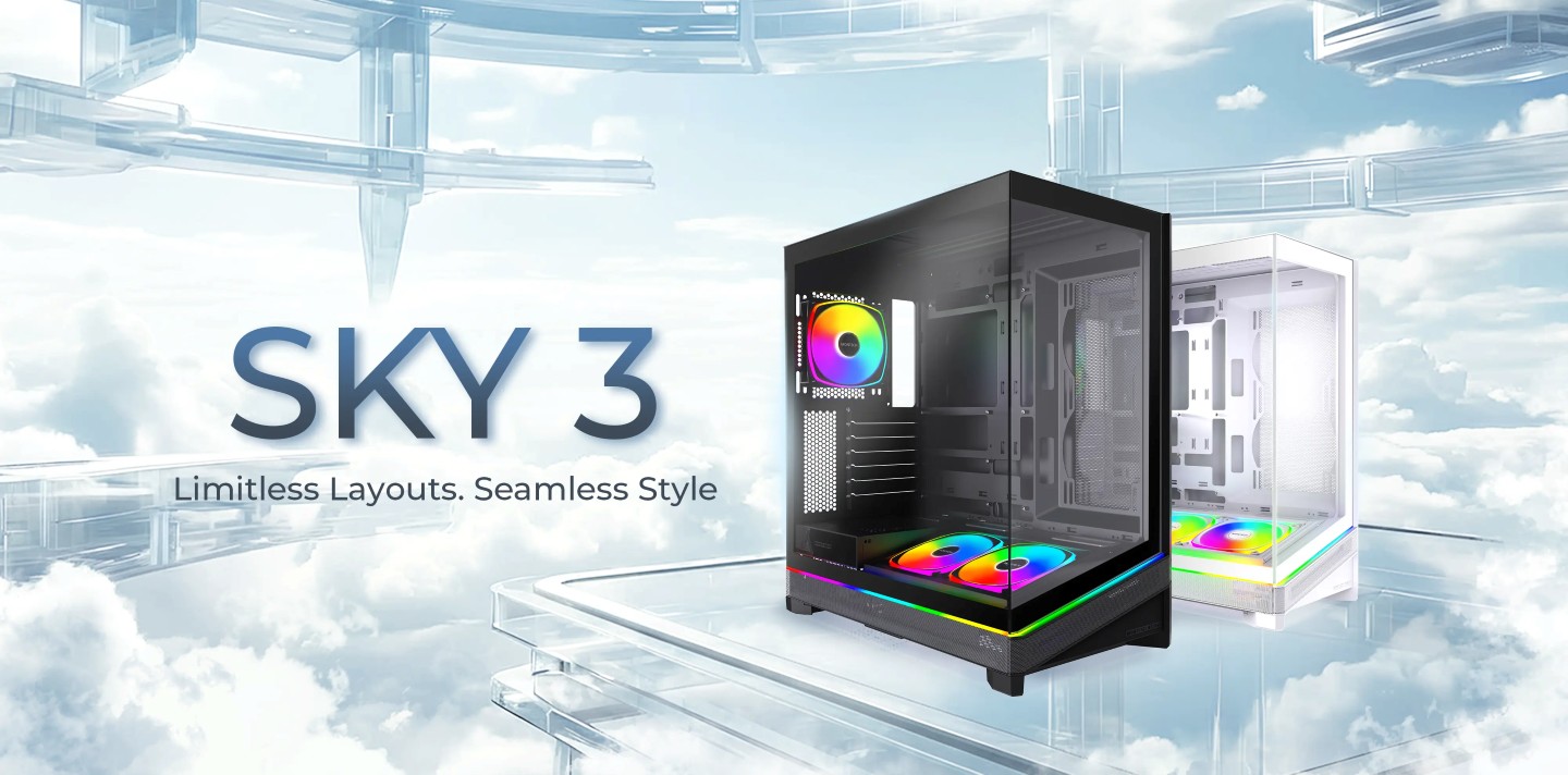 SKY 3 机箱三维 467.5×240×490.5 (mm),拥有 7 条扩展槽,属于中塔规格。其支持 ATX 主板,兼容 445mm 长度的显卡、160mm 长度的 ATX 电源、185mm 高度的处理器散热器,3.5" 与 2.5" 盘位各至多 2 个。
