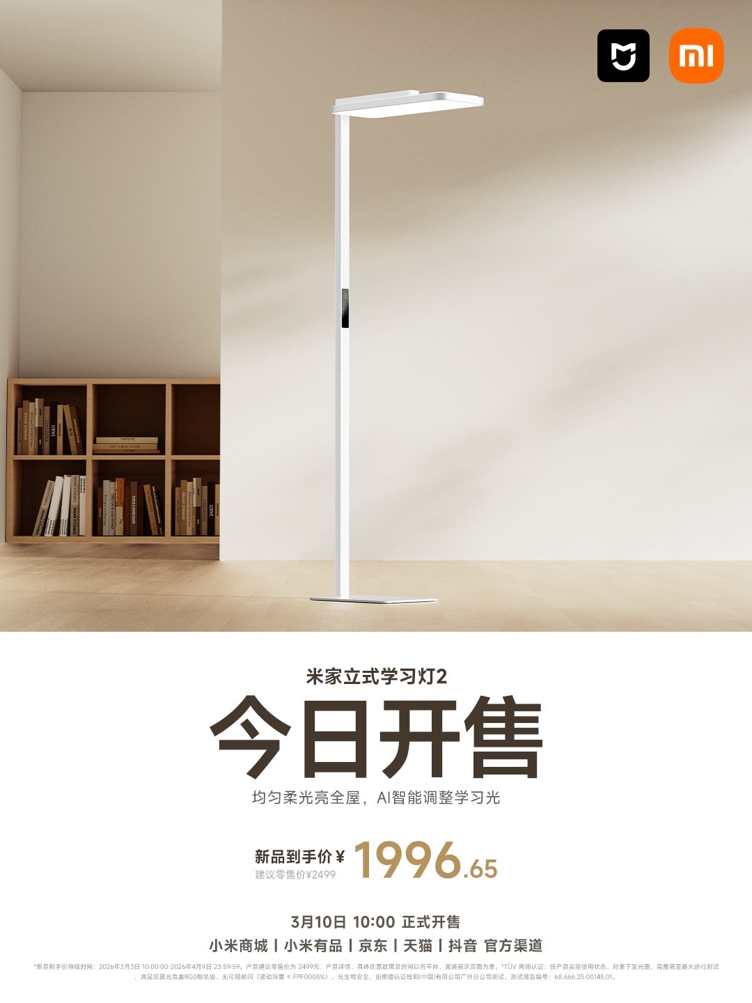 IT之家 3 月 10 日消息,小米新推出的米家立式学习灯 2 今日正式宣布开售,官方定价 2499 元,首发价 2349 元,叠加国补后 1996.65 元。
