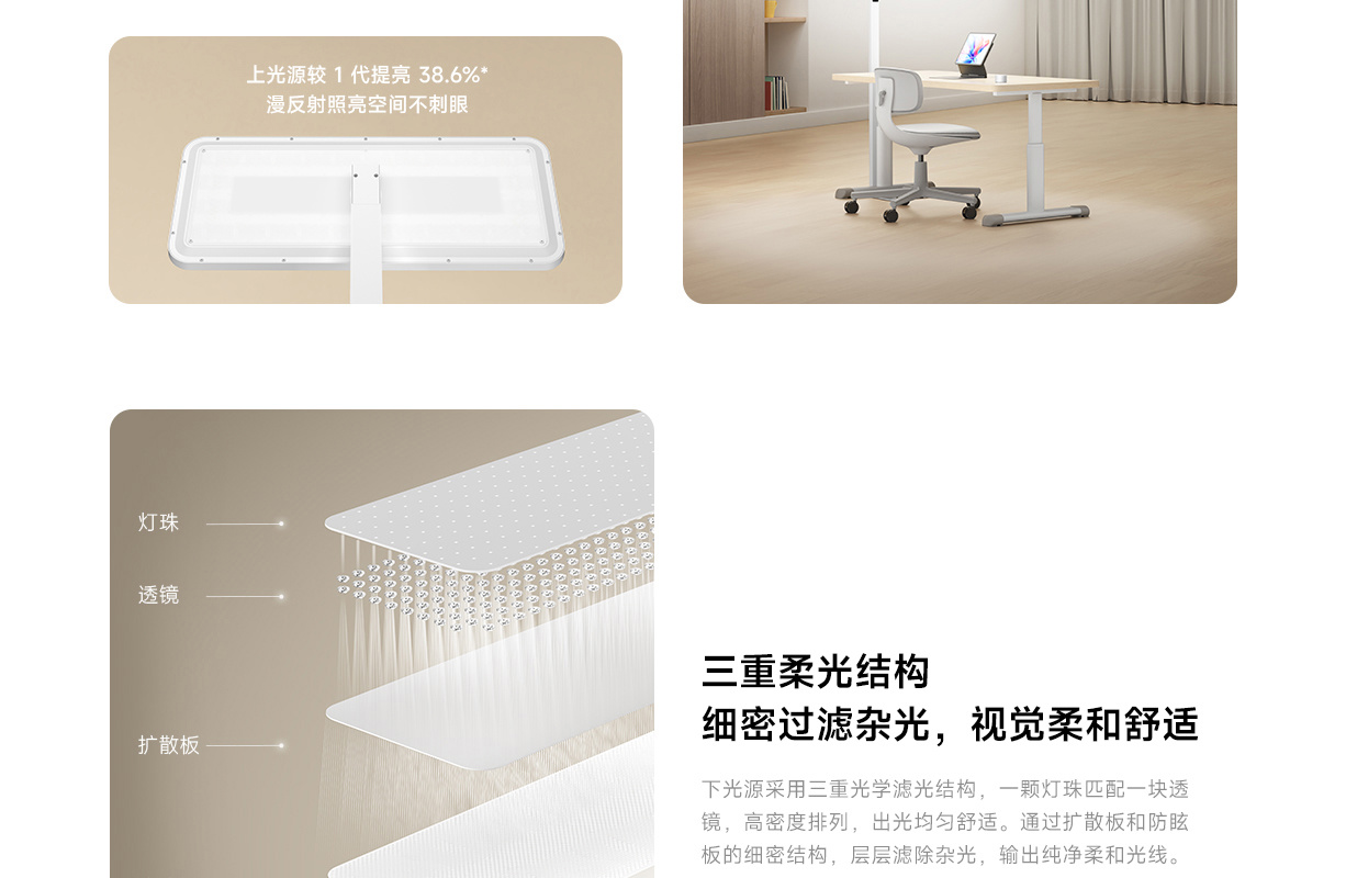 其他方面,这款灯支持防眩光(UGR<13)、Ra98 高显色,太阳光谱拟合度系数 GFC>0.985,还支持 AI 自动调光、入座感应;支持米家 App、超级小爱、灯杆触控以及遥控器操控。