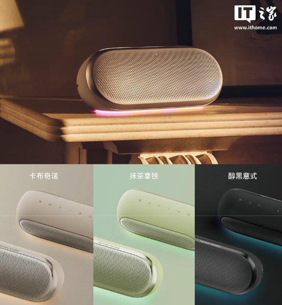 该音箱可选三种配色,整体采用铝合金材质,底部配备氛围灯光,提供 IP67 级别防护,支持通过 Harman Kardon ONE App 进行调参。