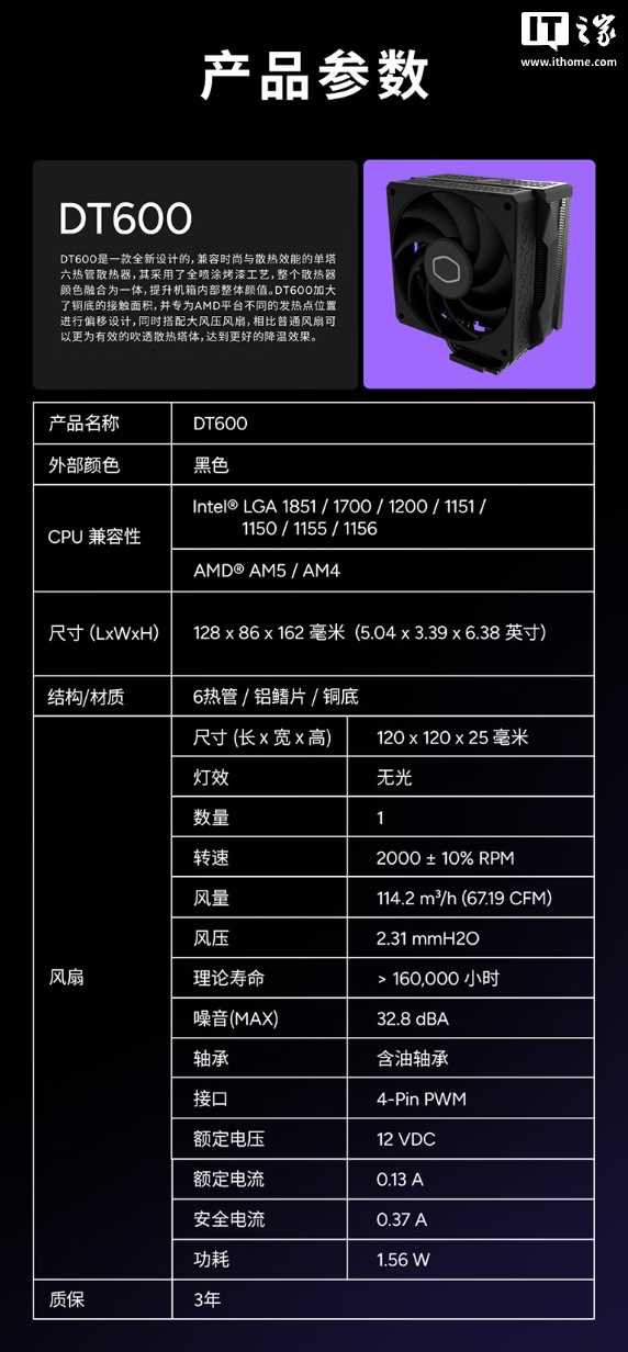 该散热器整体尺寸为 128 x 86 x 162mm,搭载了 Hyper 612 APEX 同款超导复合热管及大尺寸铜底。匹配 12025 规格风扇,最大转速 2000±10% RPM,最大风量静压分别为 67.19 CFM 和 2.31mmH2O,噪音值≤32.8 分贝。
