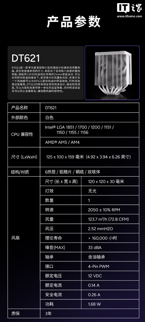 该散热器整体尺寸为 125 x 100 x 159mm,匹配 12030 规格风扇,最大转速 2050±10% RPM,最大风量静压分别为 72.8 CFM 和 2.52mmH2O,噪音值≤33 分贝。