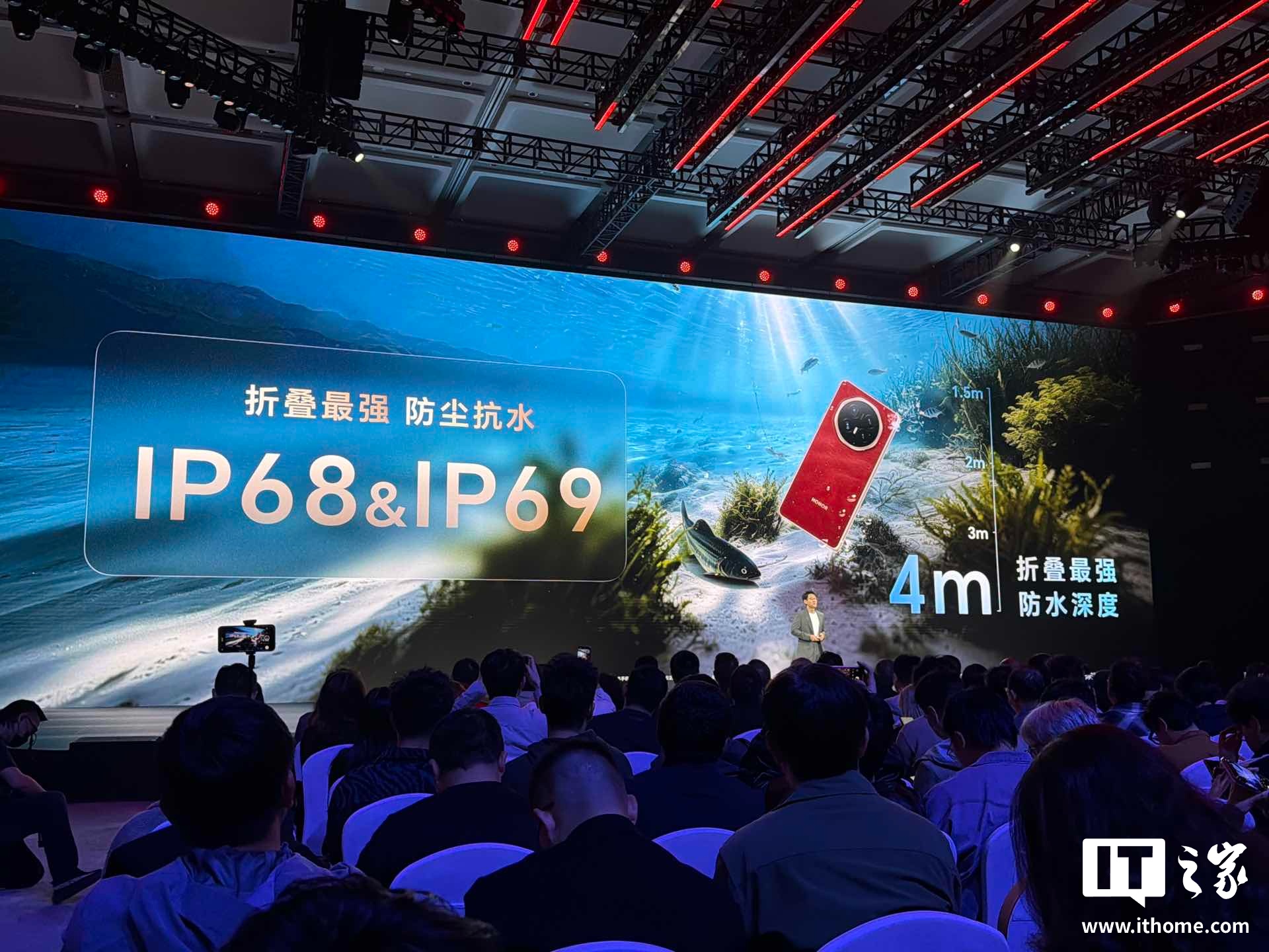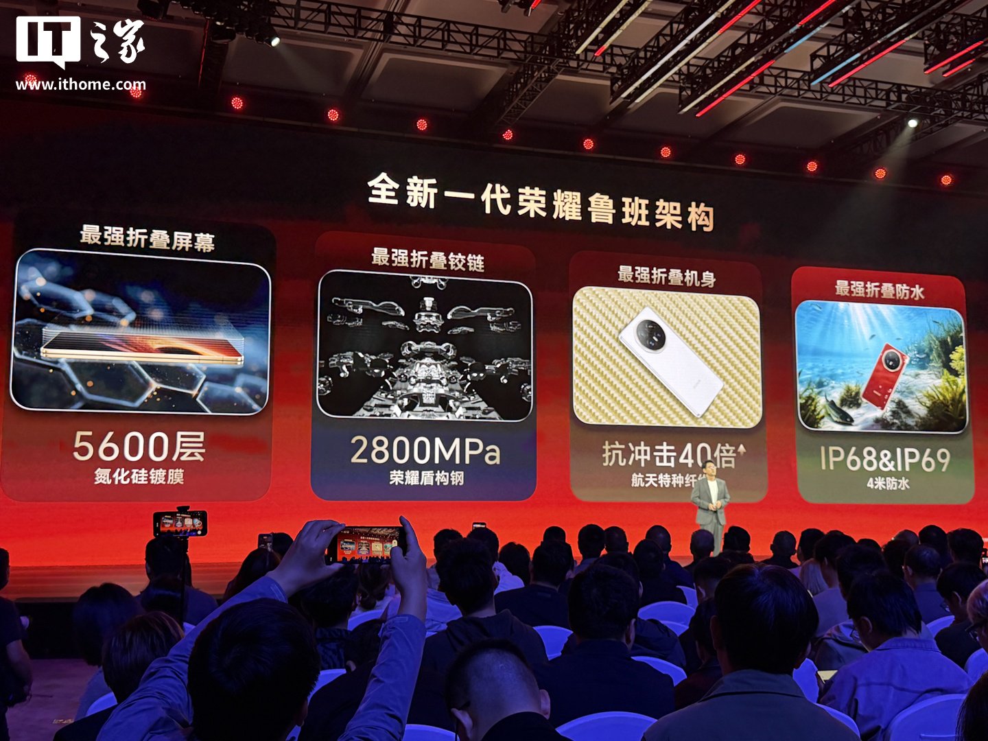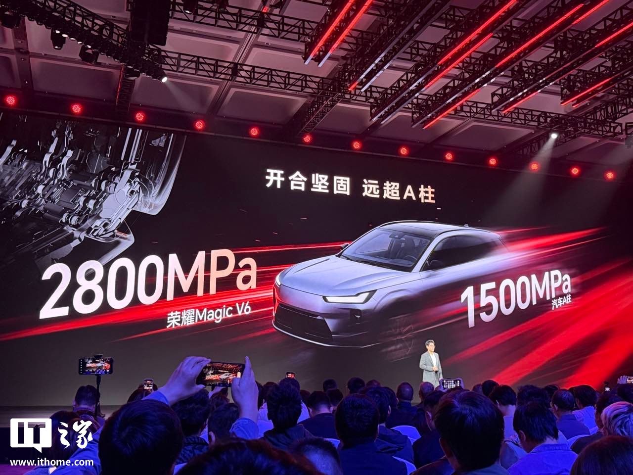 荣耀 Magic V6 搭载新一代荣耀盾构钢,通过 3150 吨航空级锻造工艺铸就机身,2800MPa 强度远超汽车 A 柱,同时具备 IP68 & IP69 双重防护,同时支持同级唯一 4 米防水。
