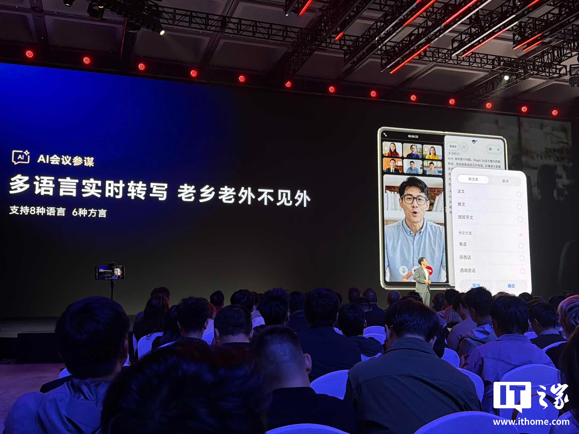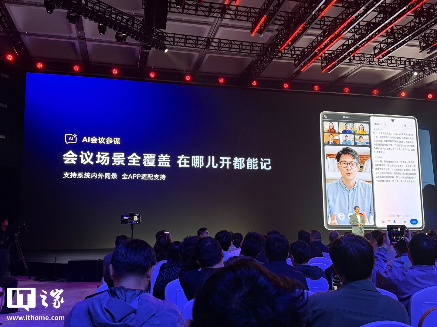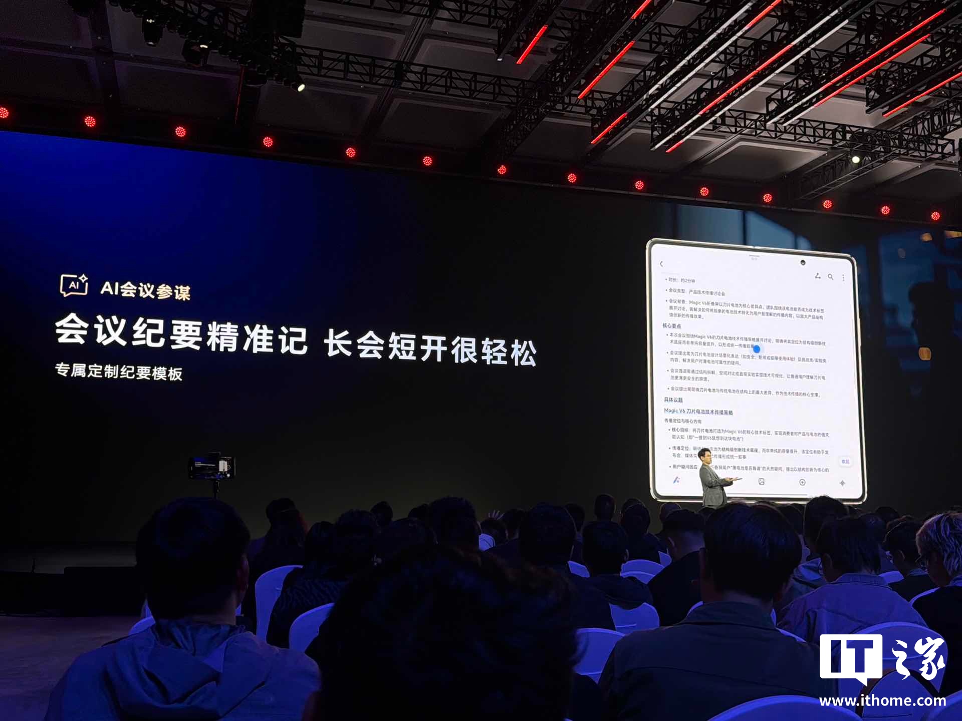 荣耀 Magic V6 还带来了会议辅助功能 —— AI 会议参谋,支持专属定制纪要模板、系统内外同录(全 App 适配支持)、8 种语言 + 6 种方言、自定义关键词、耳机手表跨端提醒、PPT / Excel / Word 一键转换等功能。