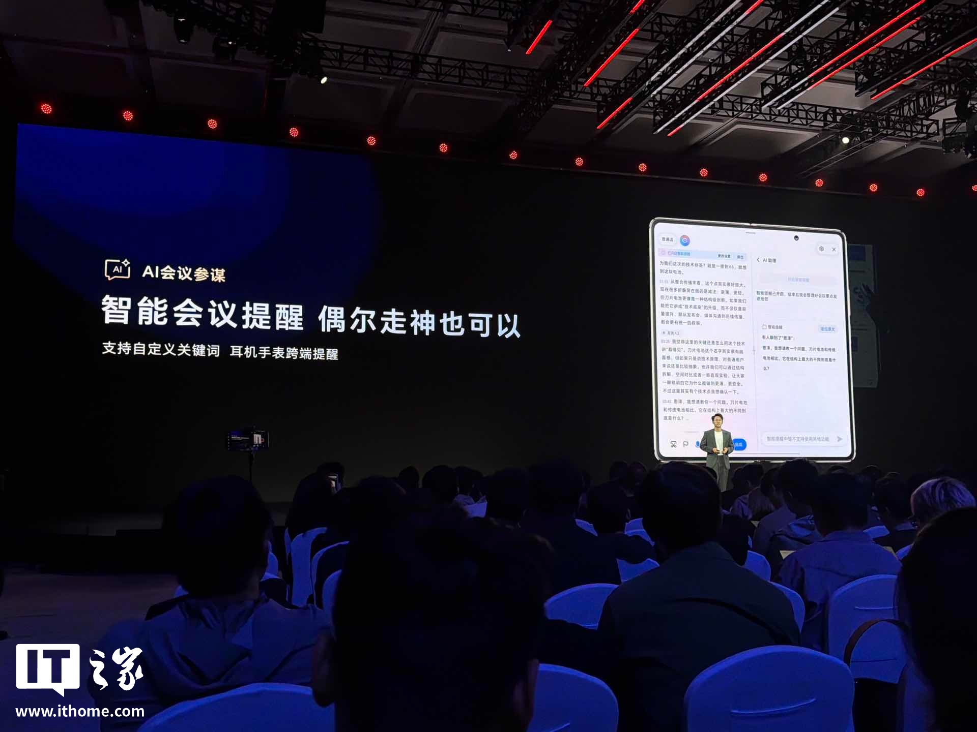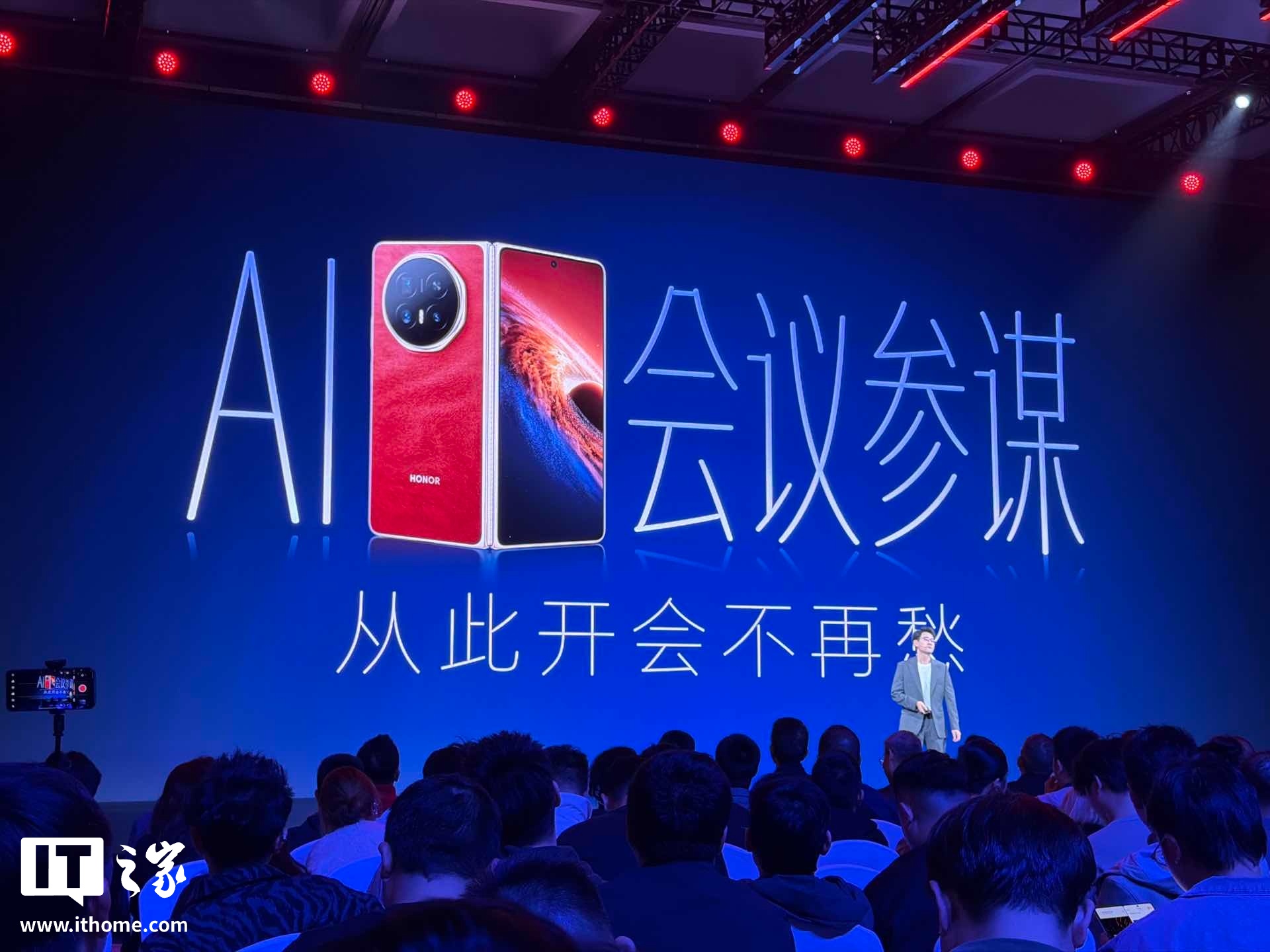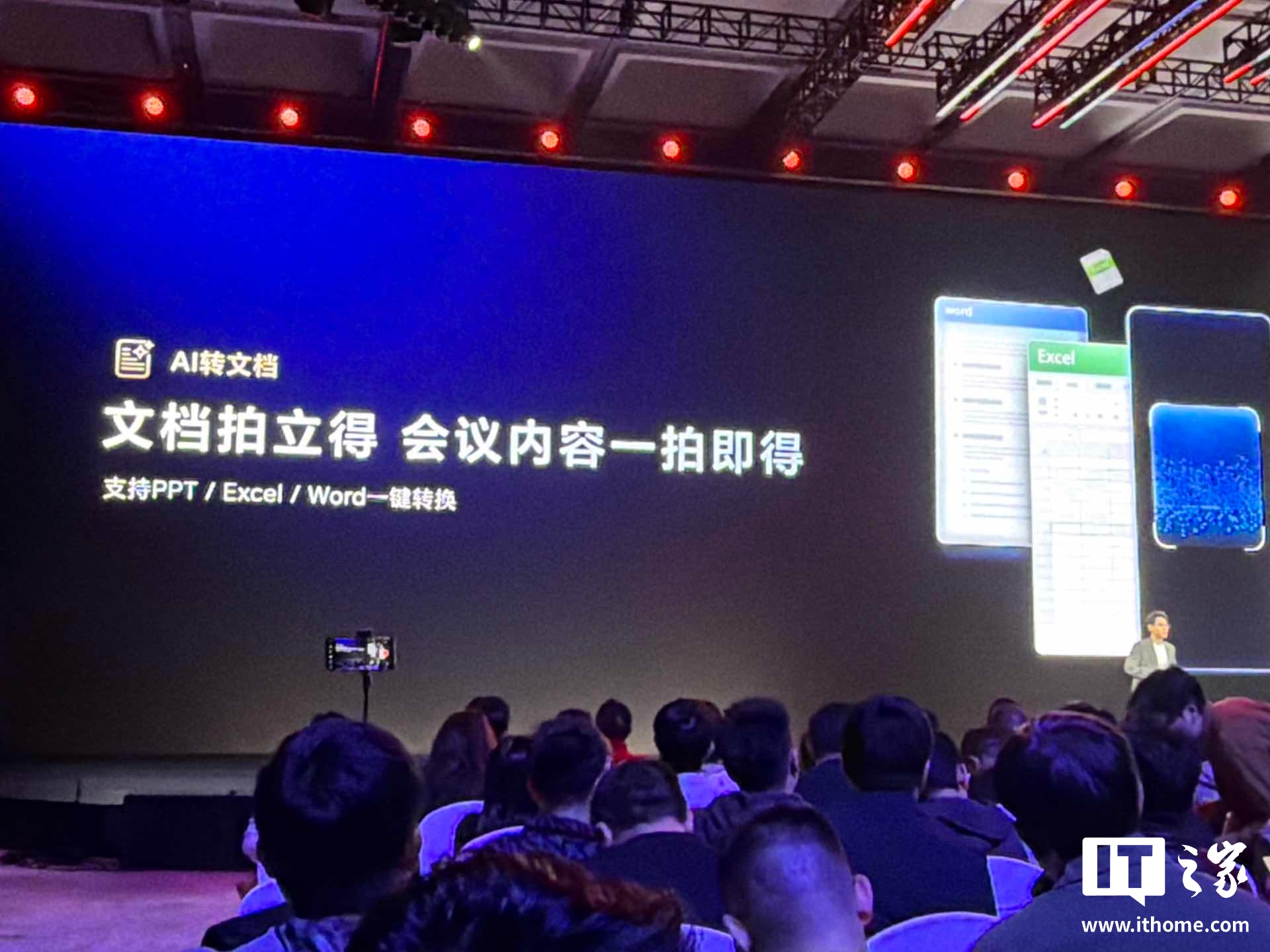 荣耀 Magic V6 还带来了会议辅助功能 —— AI 会议参谋,支持专属定制纪要模板、系统内外同录(全 App 适配支持)、8 种语言 + 6 种方言、自定义关键词、耳机手表跨端提醒、PPT / Excel / Word 一键转换等功能。