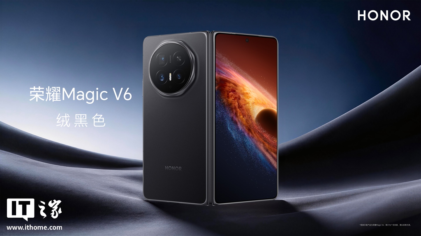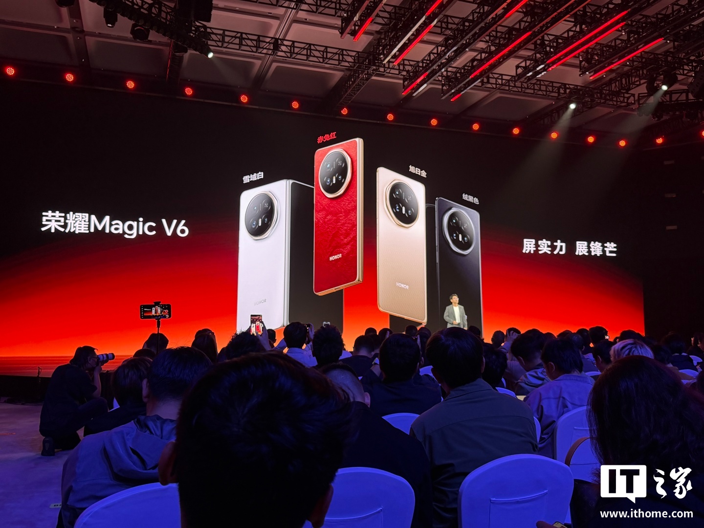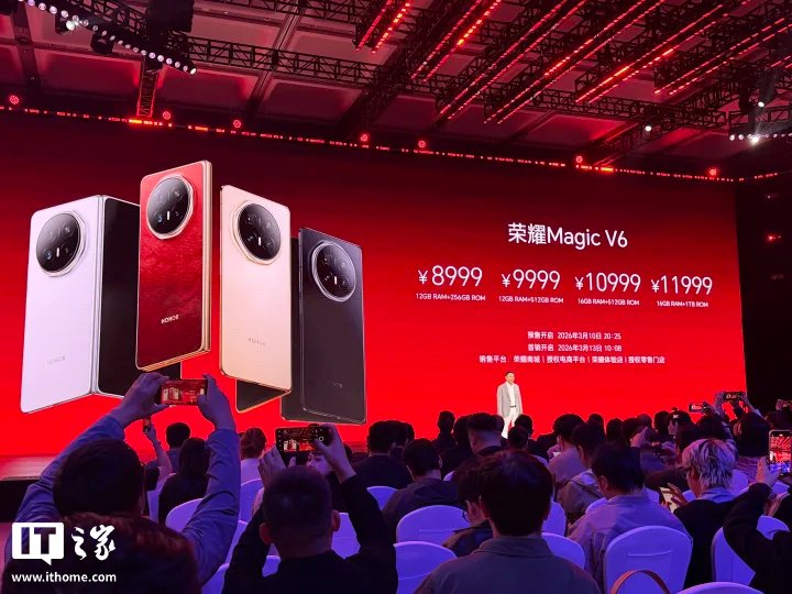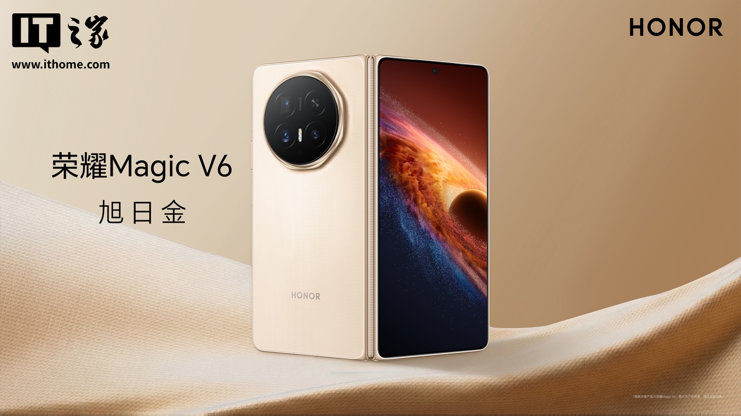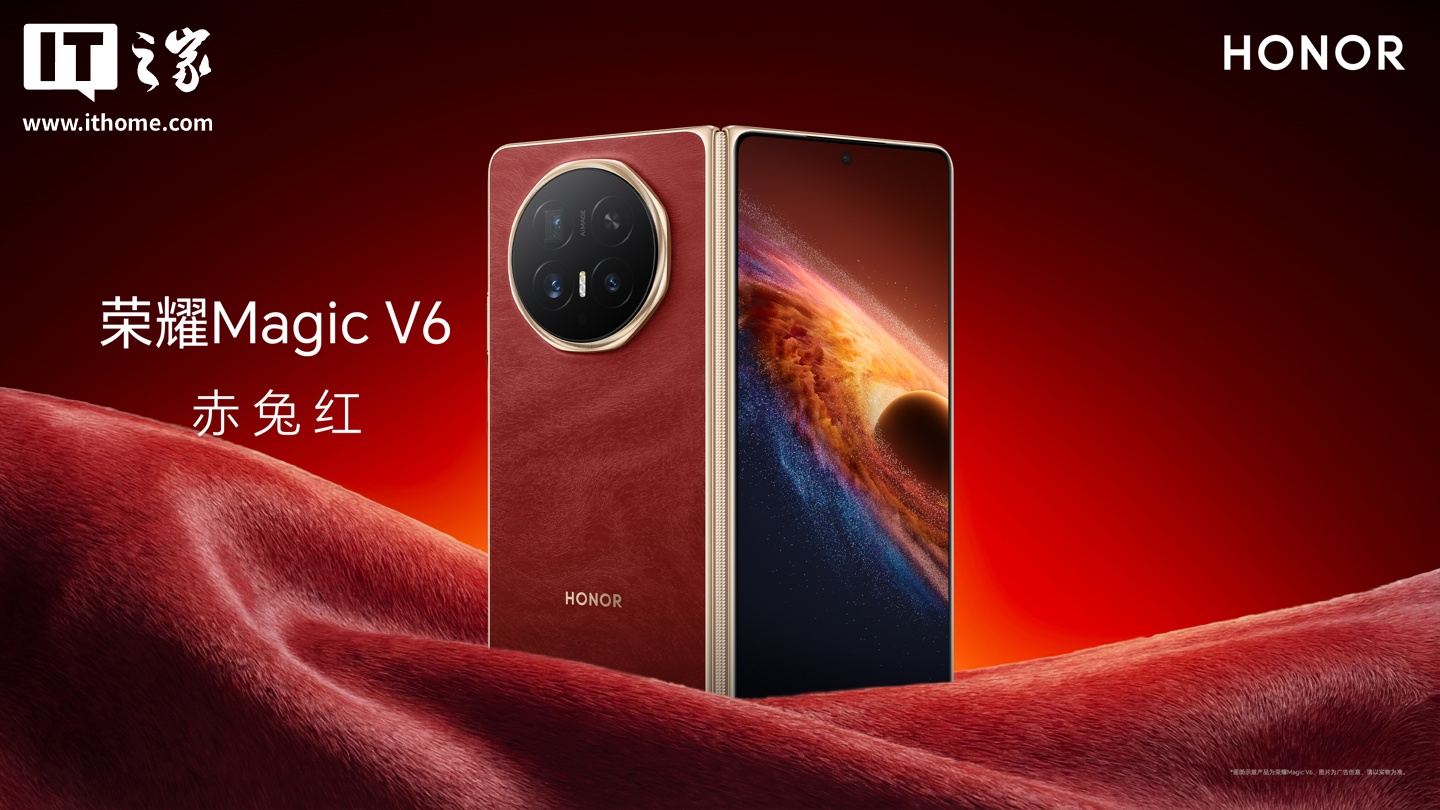 IT之家 3 月 10 日消息,荣耀 Magic V6 折叠屏手机今日正式发布,新机搭载满血第五代骁龙 8 至尊版处理器、最高内置 7150mAh 青海湖电池,提供赤兔红、旭日金、雪域白和绒黑色四种配色,8999 元起。