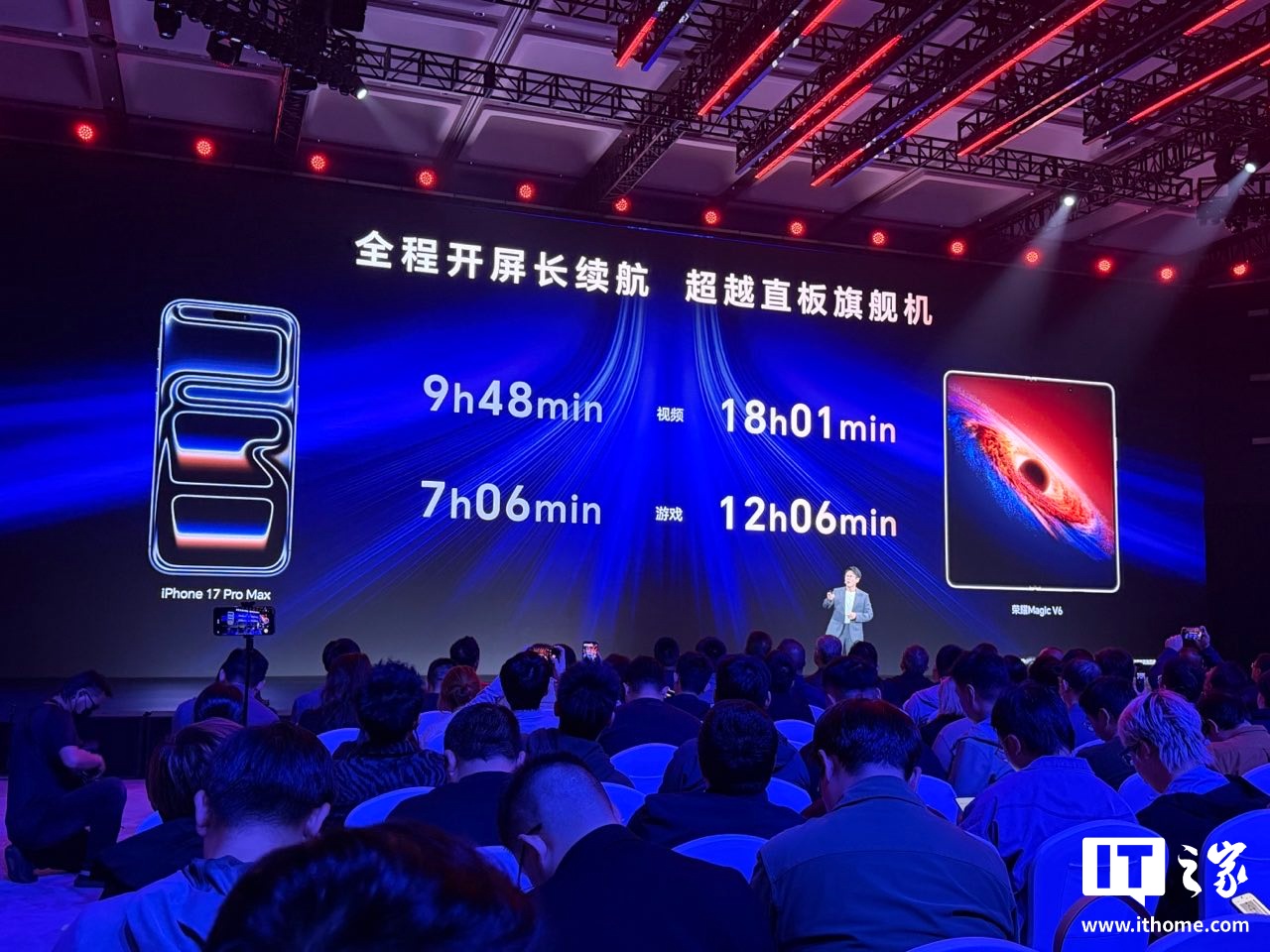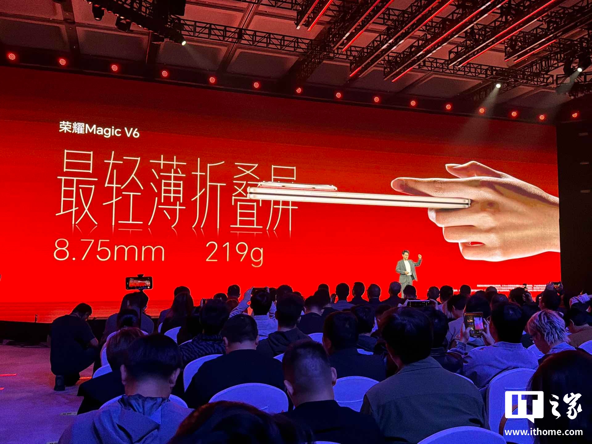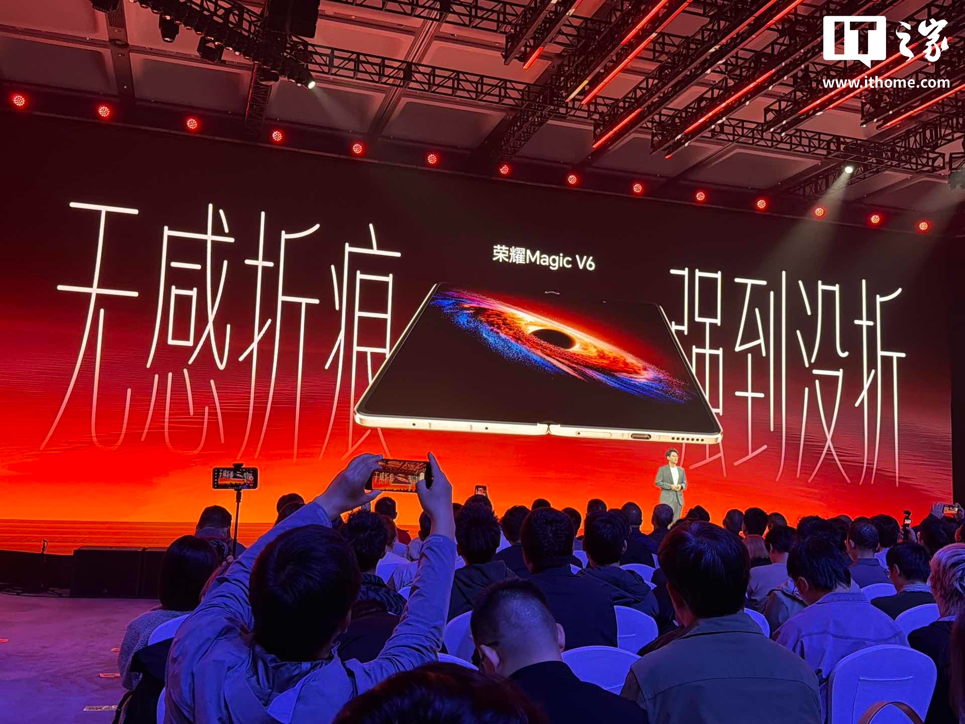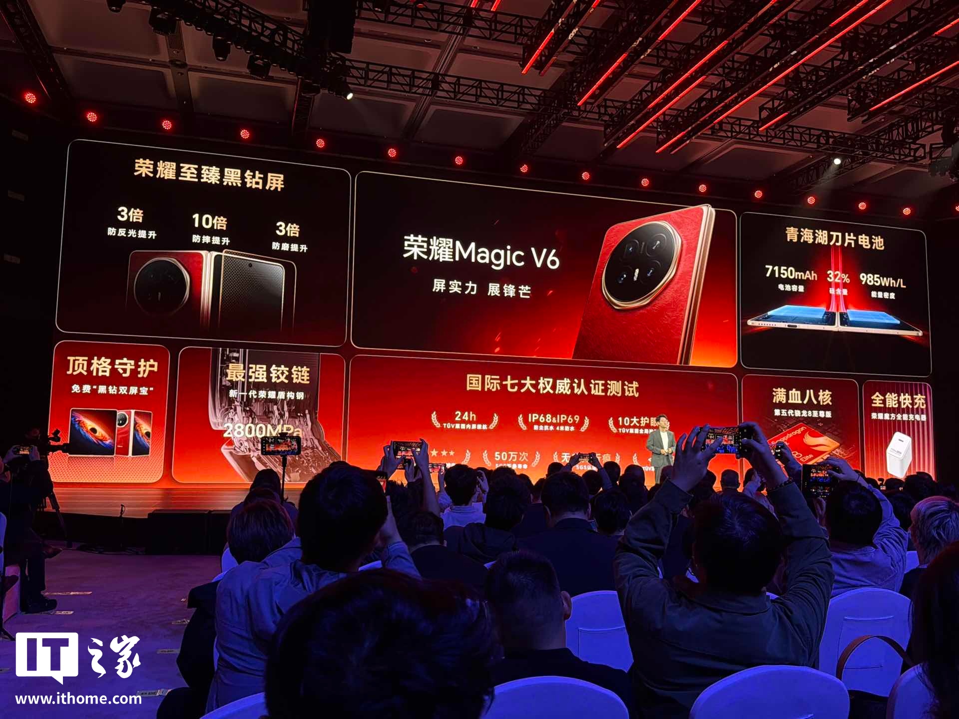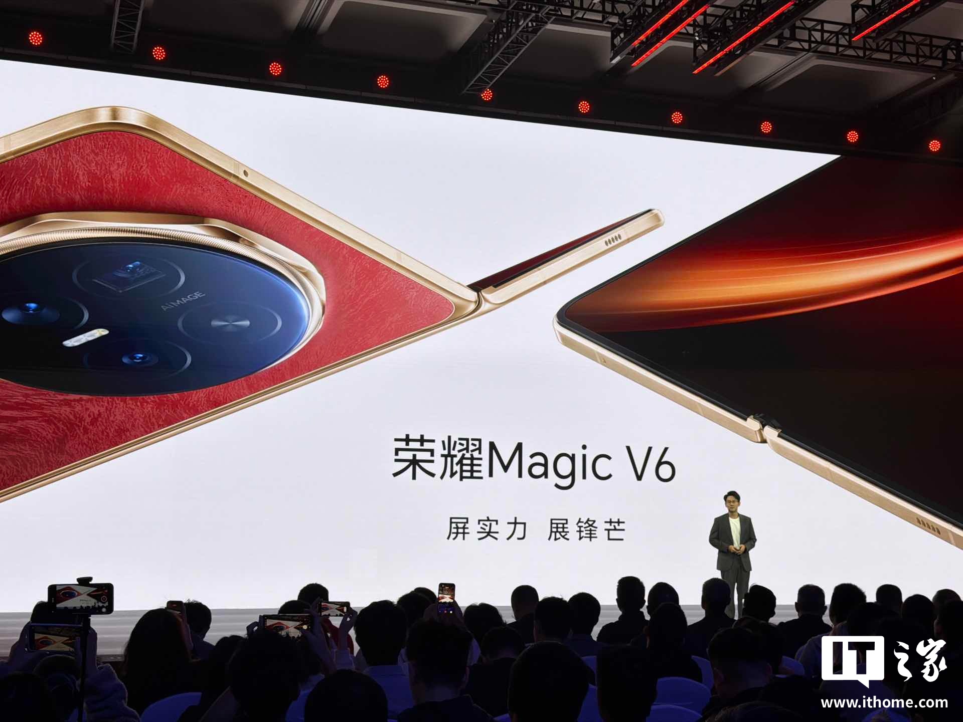 IT之家 3 月 10 日消息,荣耀 Magic V6 折叠屏手机今日正式发布,新机搭载满血第五代骁龙 8 至尊版处理器、最高内置 7150mAh 青海湖电池,提供赤兔红、旭日金、雪域白和绒黑色四种配色,8999 元起。