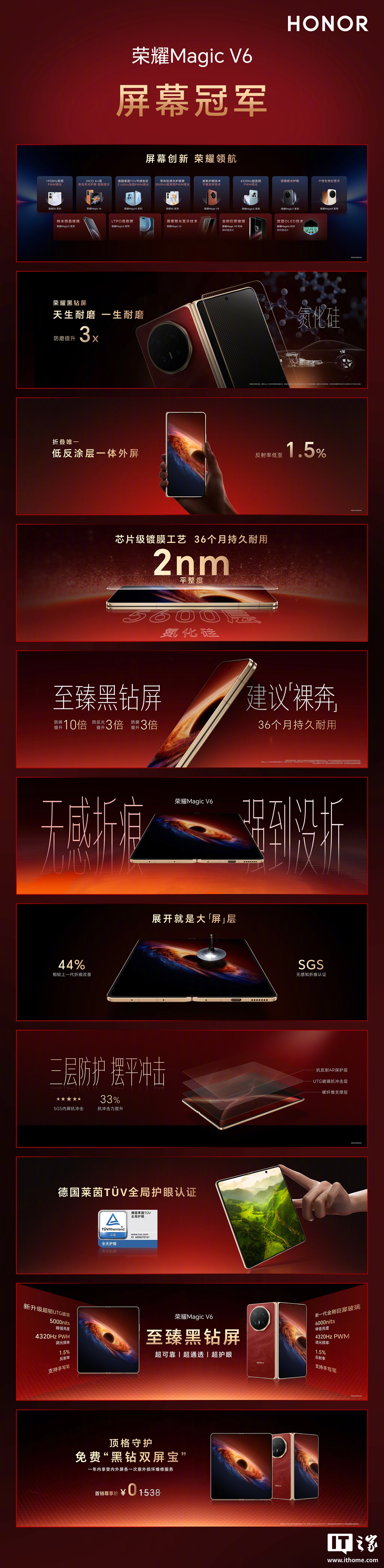 荣耀 Magic V6 至臻黑钻屏亮点如下(该机支持免费“黑钻双屏宝”:一年内享受内外屏各一次意外损坏维修服务):
