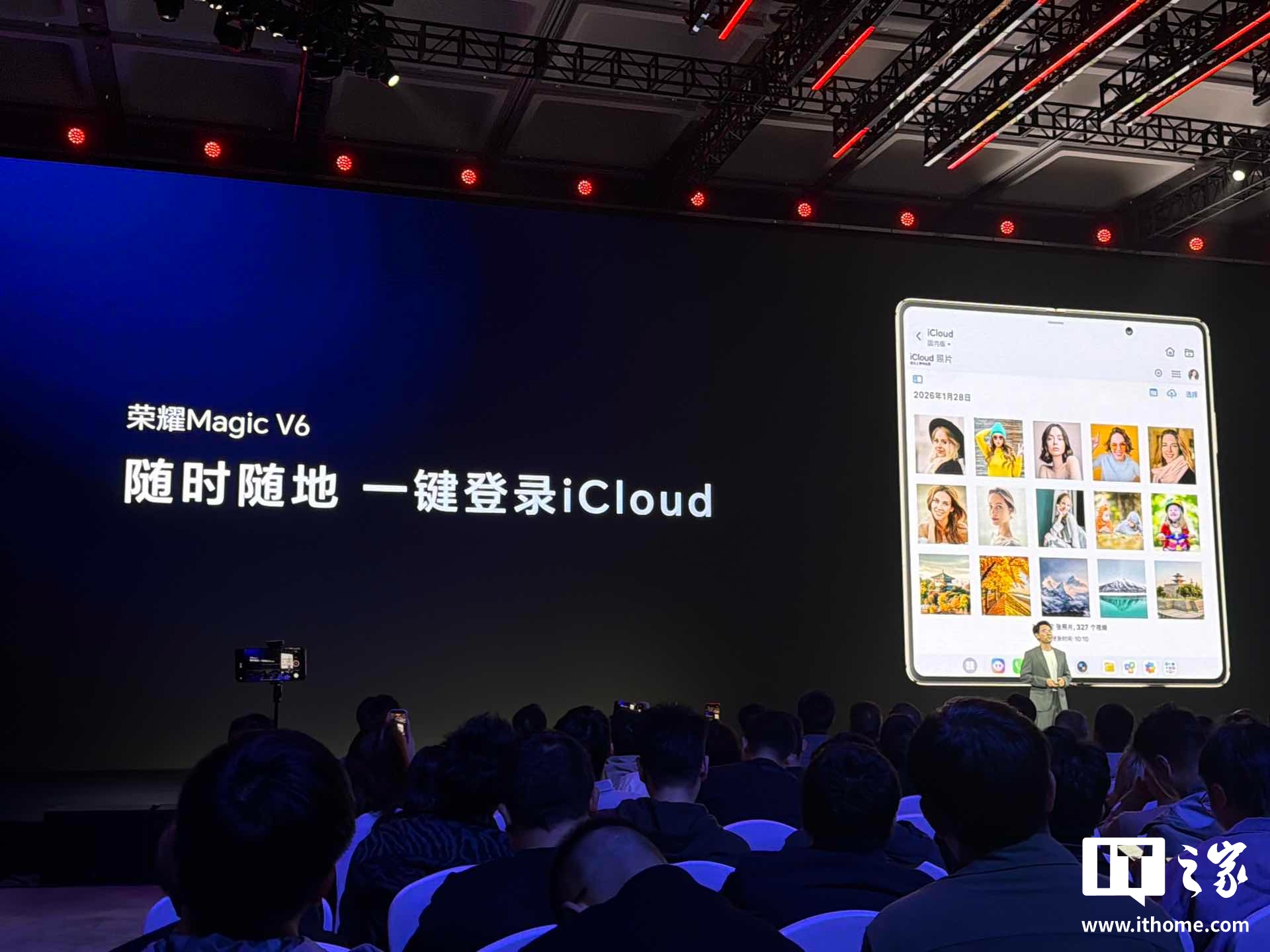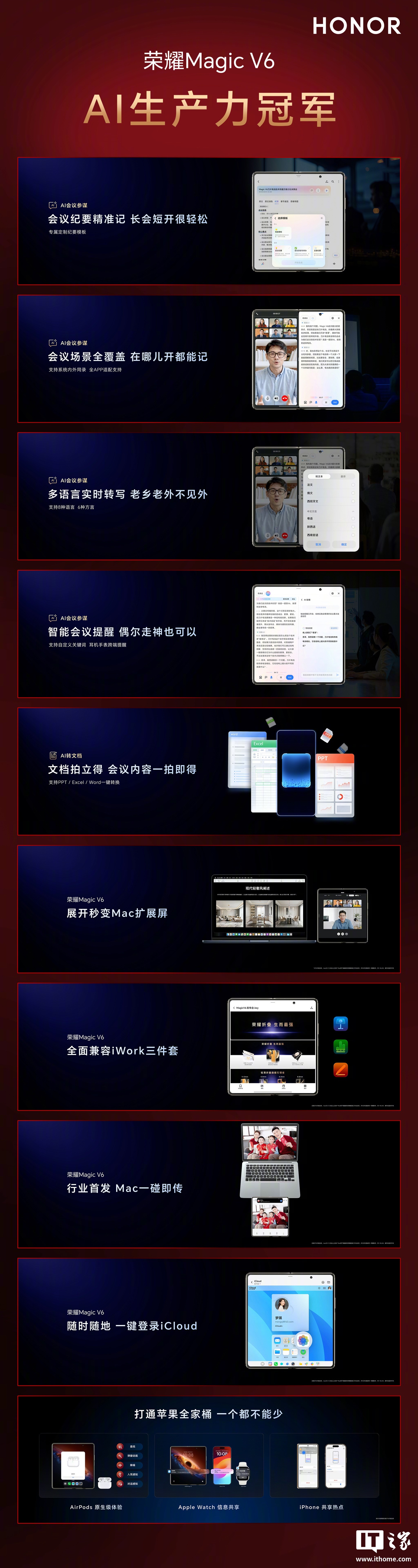 荣耀 Magic V6 还兼容苹果生态,可查看 iCloud 云图库、秒变 Mac 拓展屏、兼容 iWork 三件套、行业首发 Mac 一碰即传等功能,同时还支持 AirPods 原生级体验、Apple Watch 信息共享、iPhone 共享热点等功能。