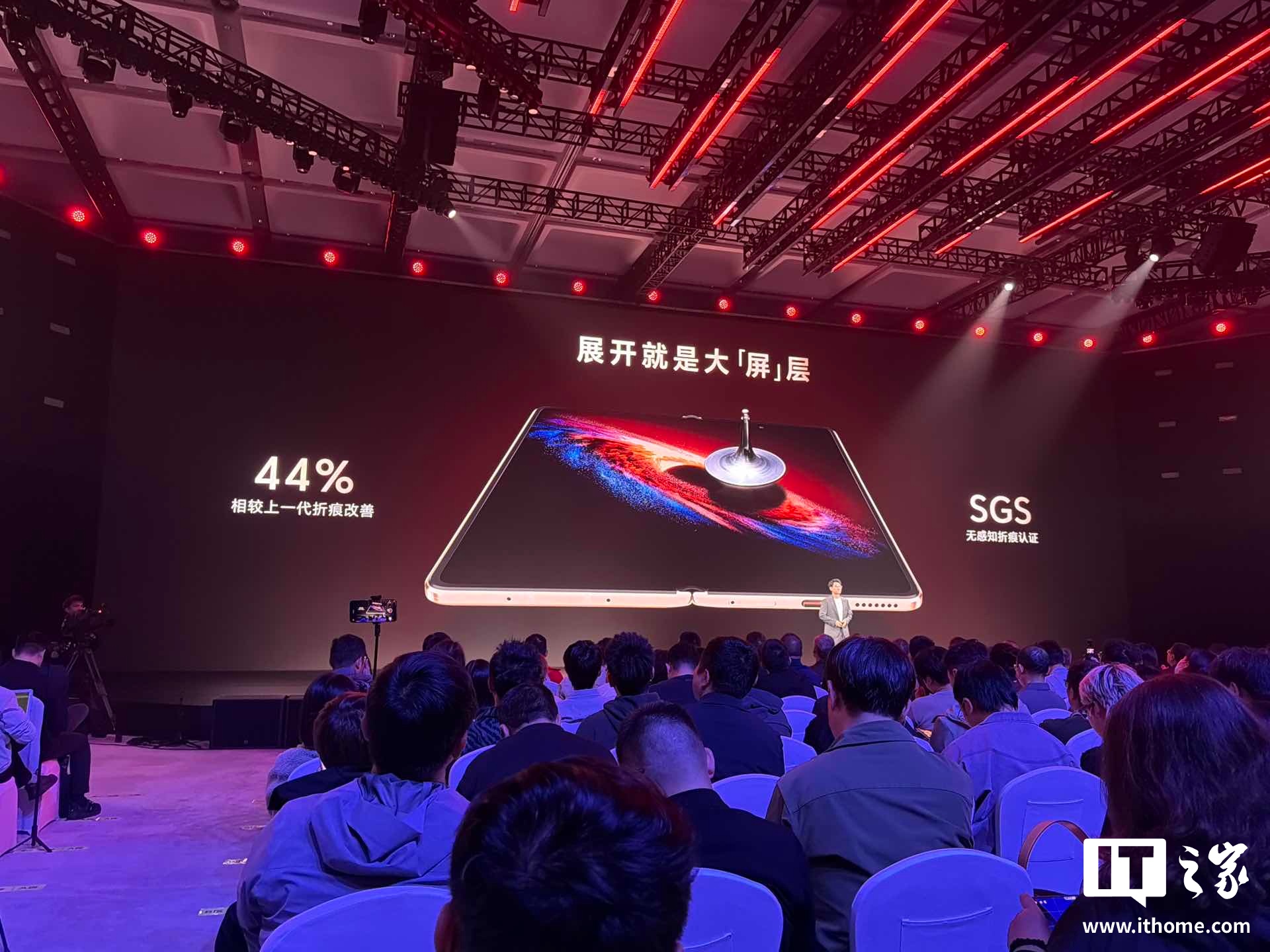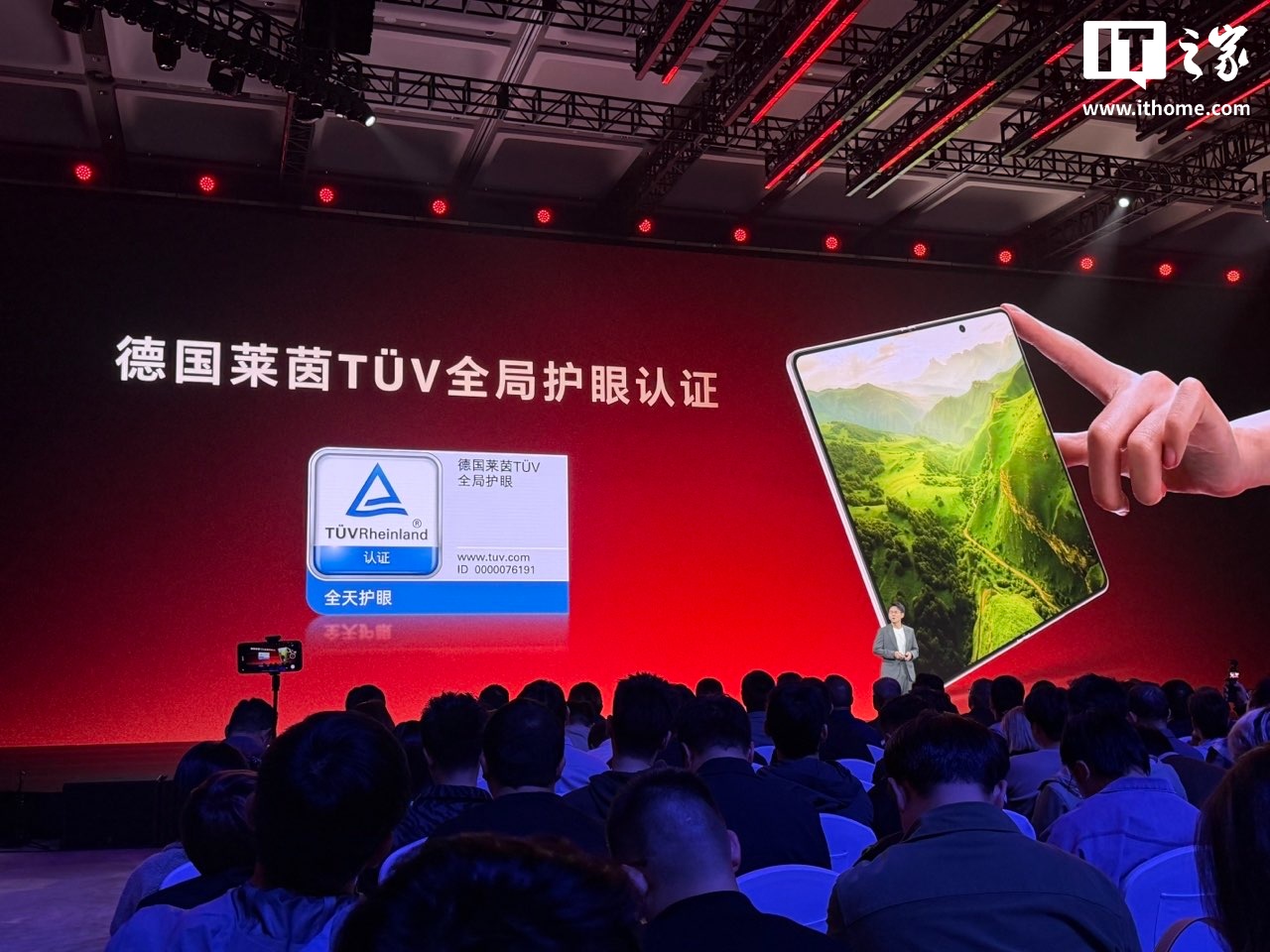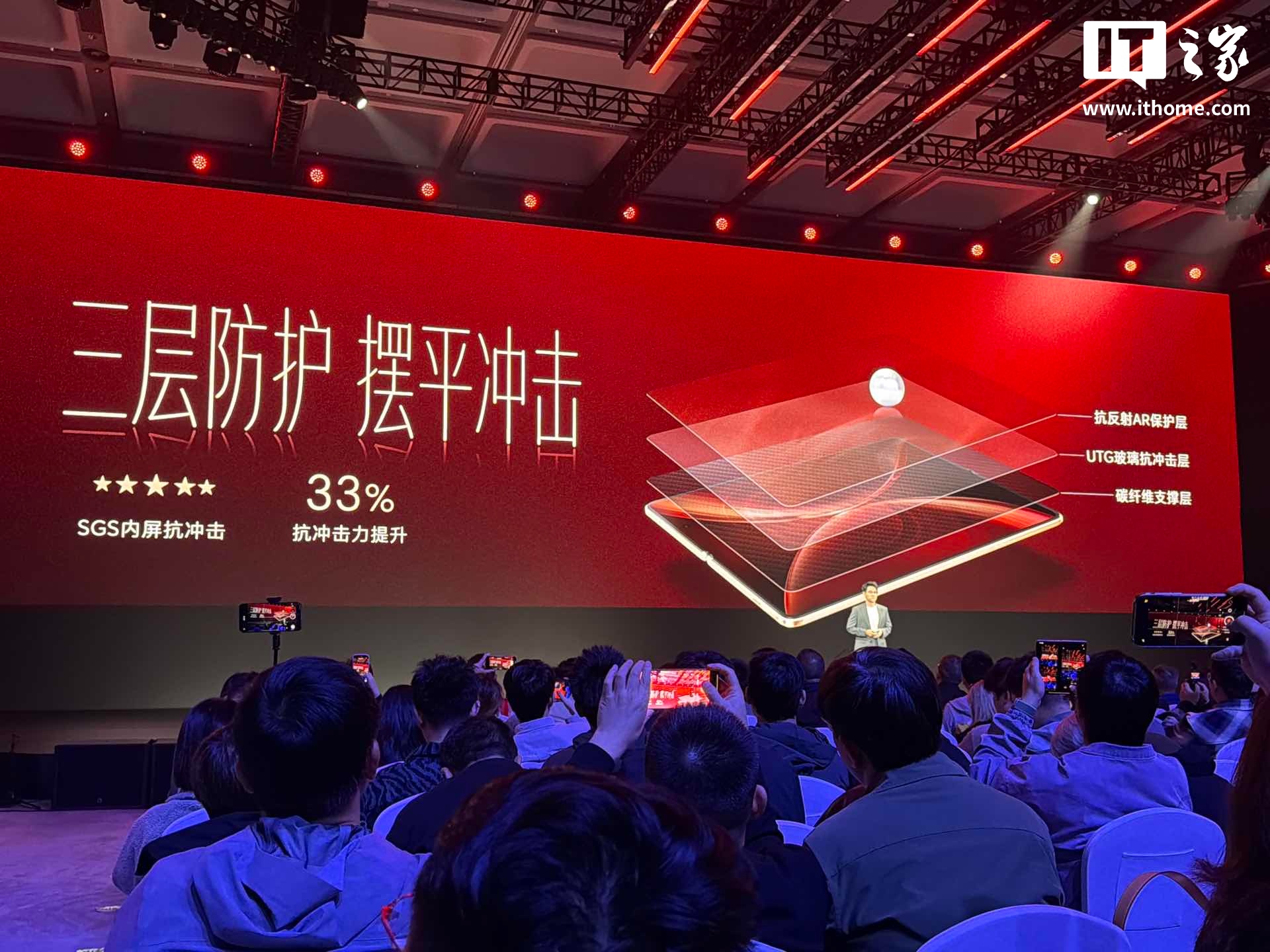 荣耀 Magic V6 的内屏支持「无感折痕」特性,折痕相较上一代改善 44%,并通过 SGS 无感知折痕认证。内屏由抗反射 AR 保护层 + UTG 玻璃抗冲击层 + 碳纤维支撑层构成,宣称抗冲击力提升 33%,同时还通过德国莱茵 TÜV 全局护眼认证。
