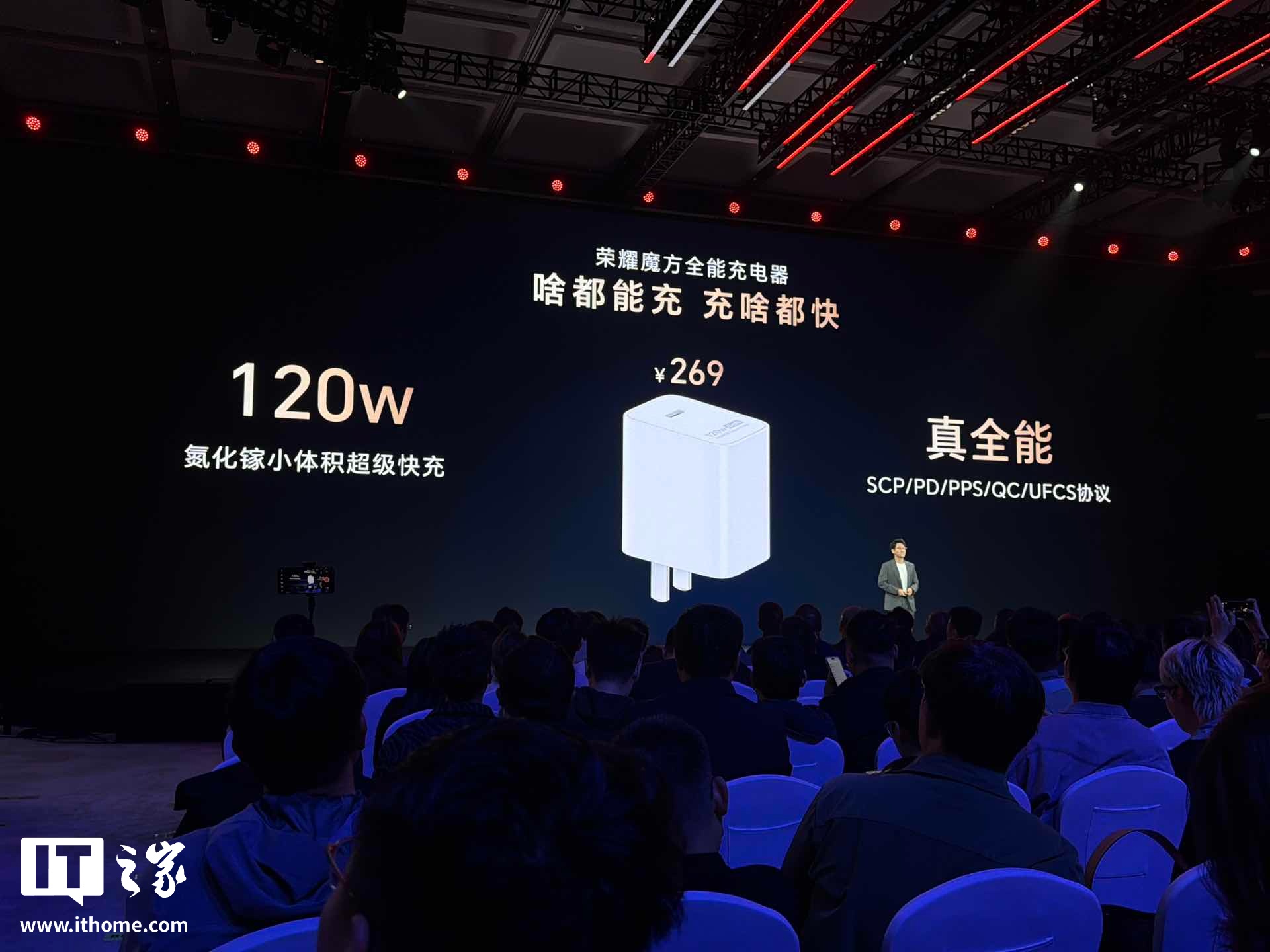 荣耀还带来了 120W 氮化镓小体积超级快充器,支持 SCP / PD / PPS / QC / UFCS 协议,售价 269 元。荣耀官方表示,Magic V6 手机用户可以免费拿到这款充电器。