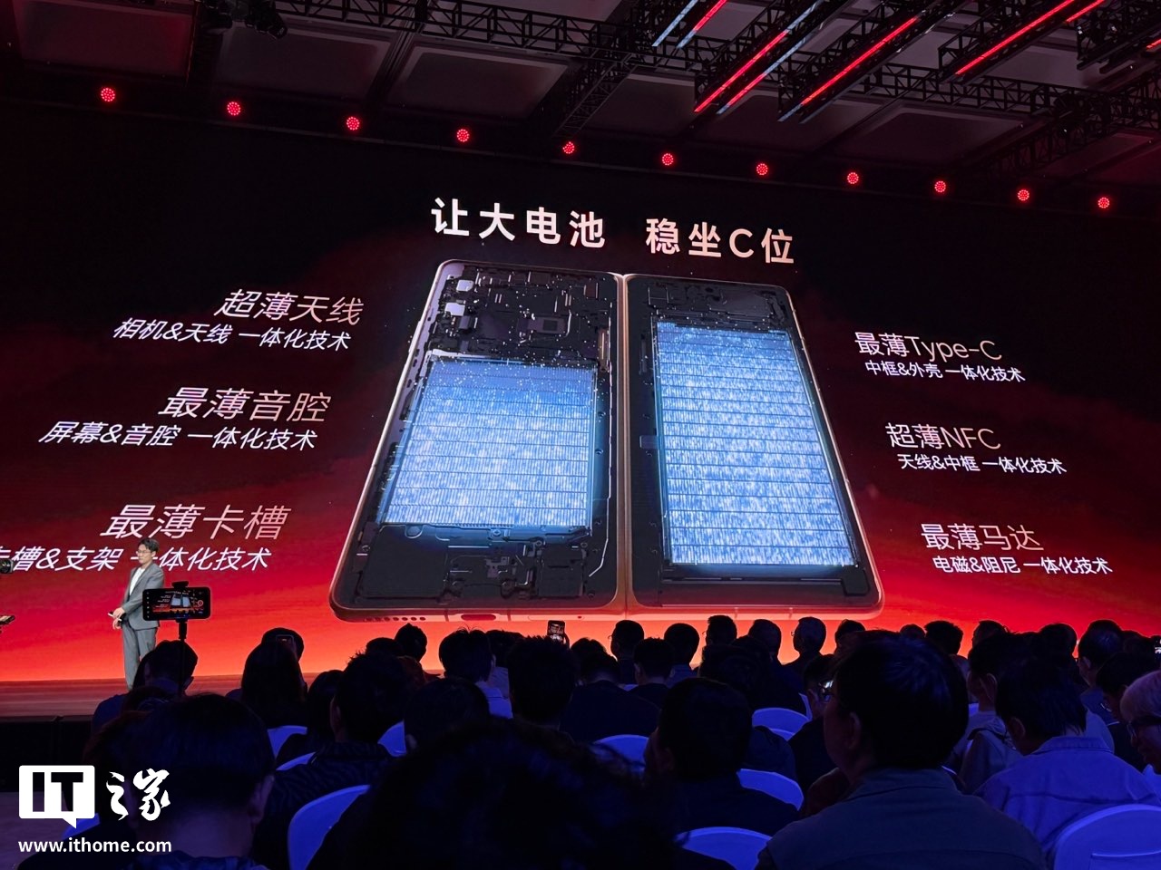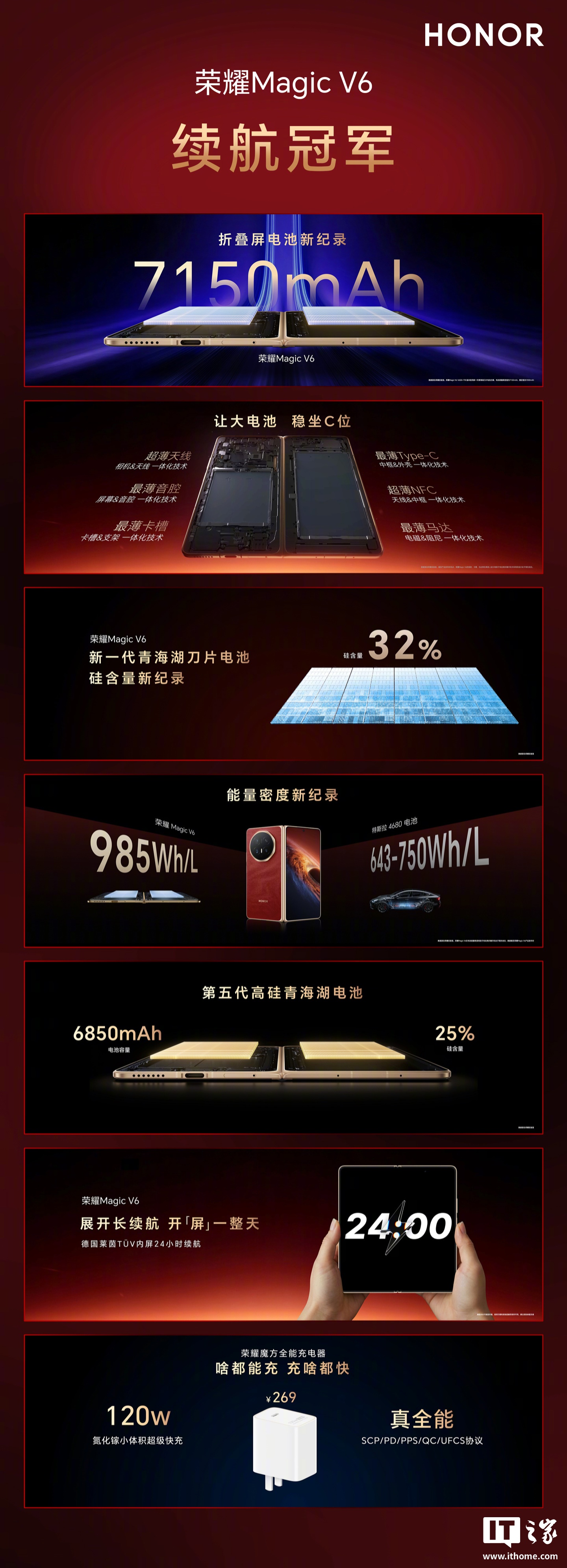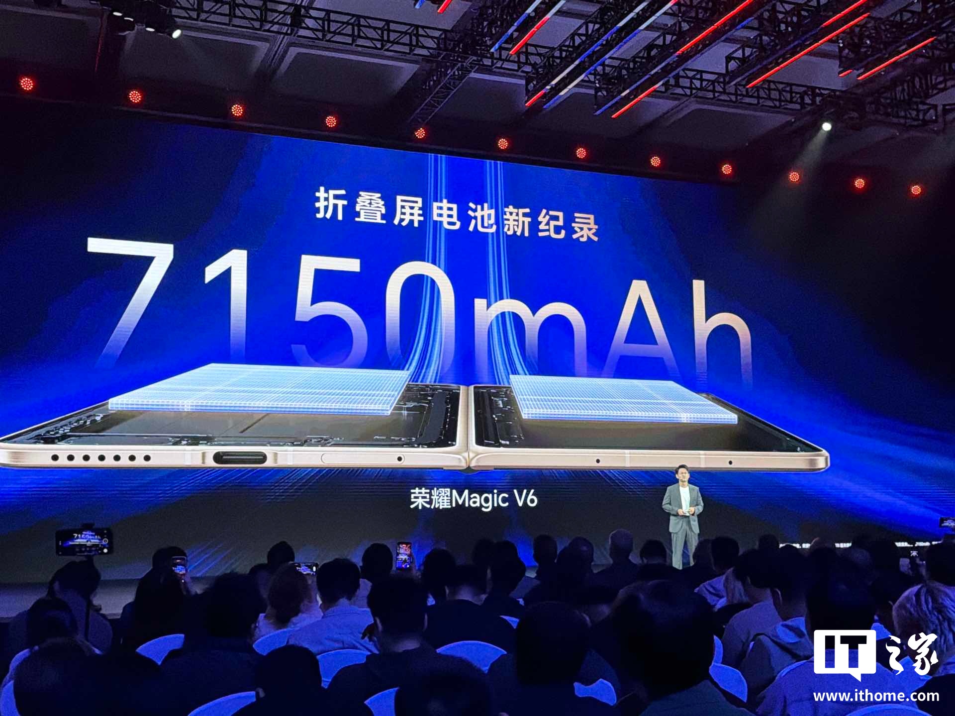 荣耀 Magic V6 还搭载了 7150mAh 全新一代青海湖刀片电池,刷新折叠屏电池新纪录,硅含量突破 32%、能量密度 985Wh/L。该机还采用超薄天线 + 超薄音腔 + 最薄卡槽设计,同时拥有最薄 Type-C、超薄 NFC 和最薄马达。
