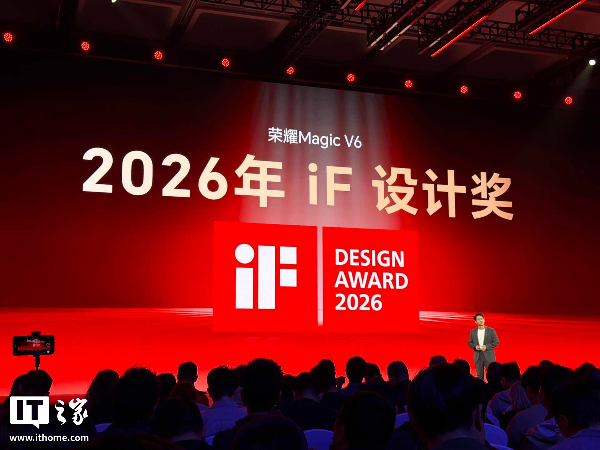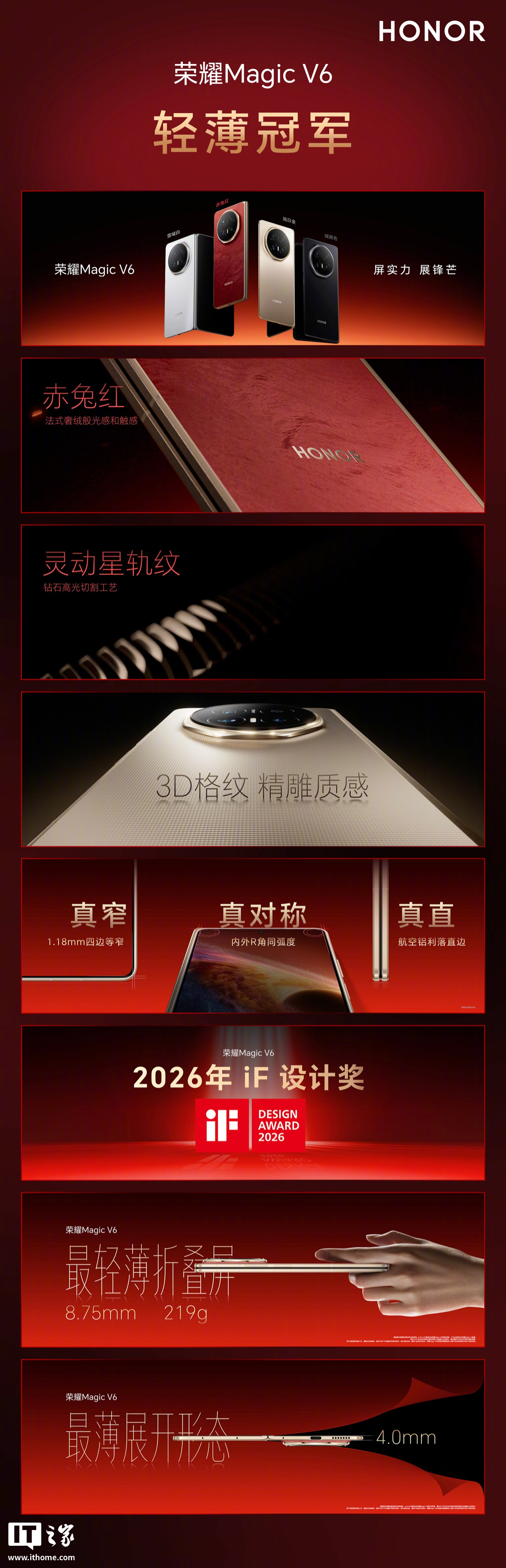 荣耀 Magic V6 折叠屏手机后盖采用 3D 格纹精雕质感设计 + 航空铝直边方案,内外 R 角同弧度,边框 1.18mm 实现四边等窄效果,并拿下 2026 年 iF 设计奖。