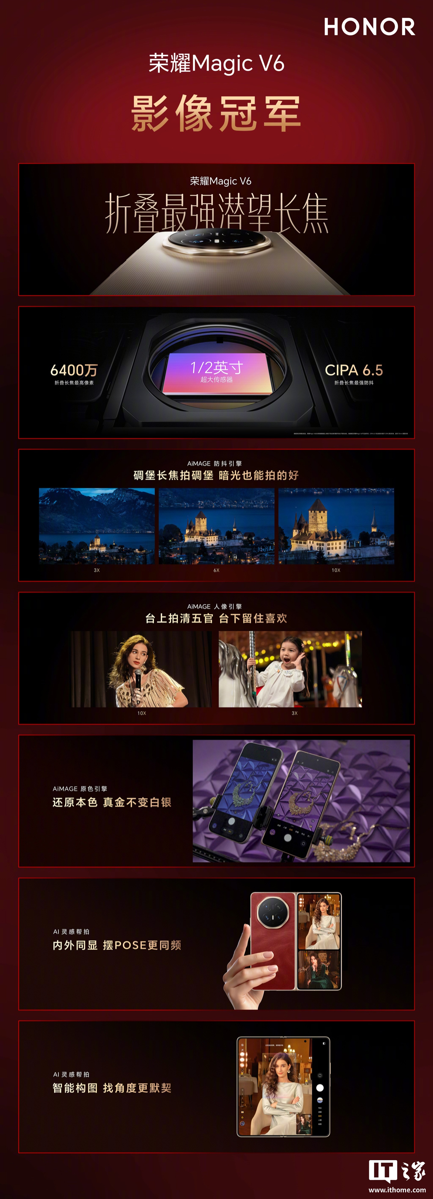 荣耀 Magic V6 折叠屏手机搭载 6400 万像素长焦镜头,拥有 1/2 英寸传感器,支持 CIPA6.5 级防抖、AiMAGE 原色引擎,并提供 AI 灵感帮拍智能构图、内外屏同显等功能。