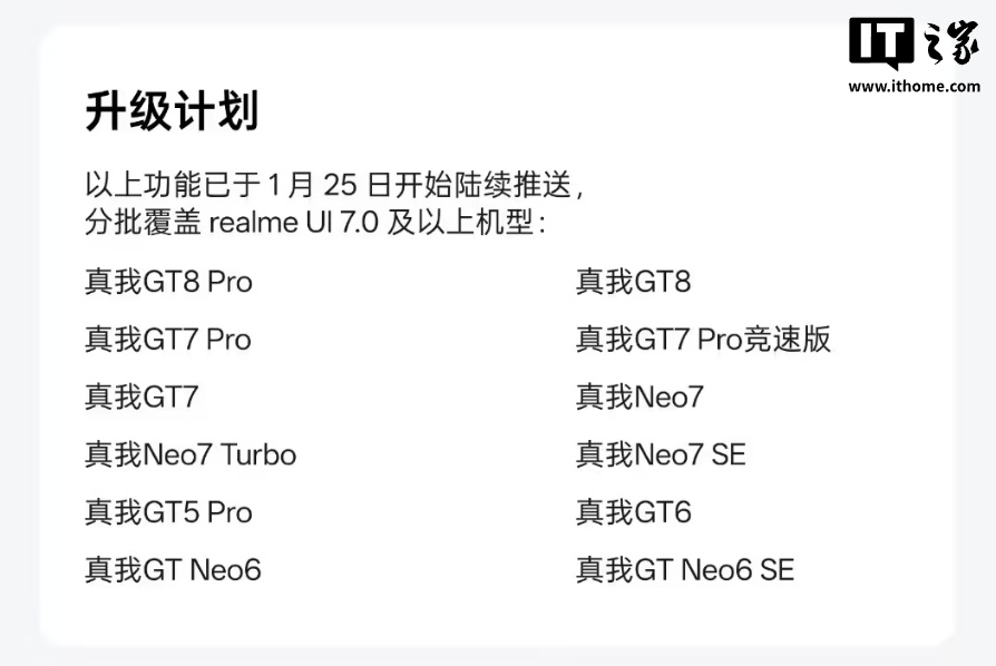 IT之家查询真我手机过往更新记录,realme UI 产品经理 @康达Leo 所指的“GT Neo 6 SE 及以上机型”预计将包括如下设备: