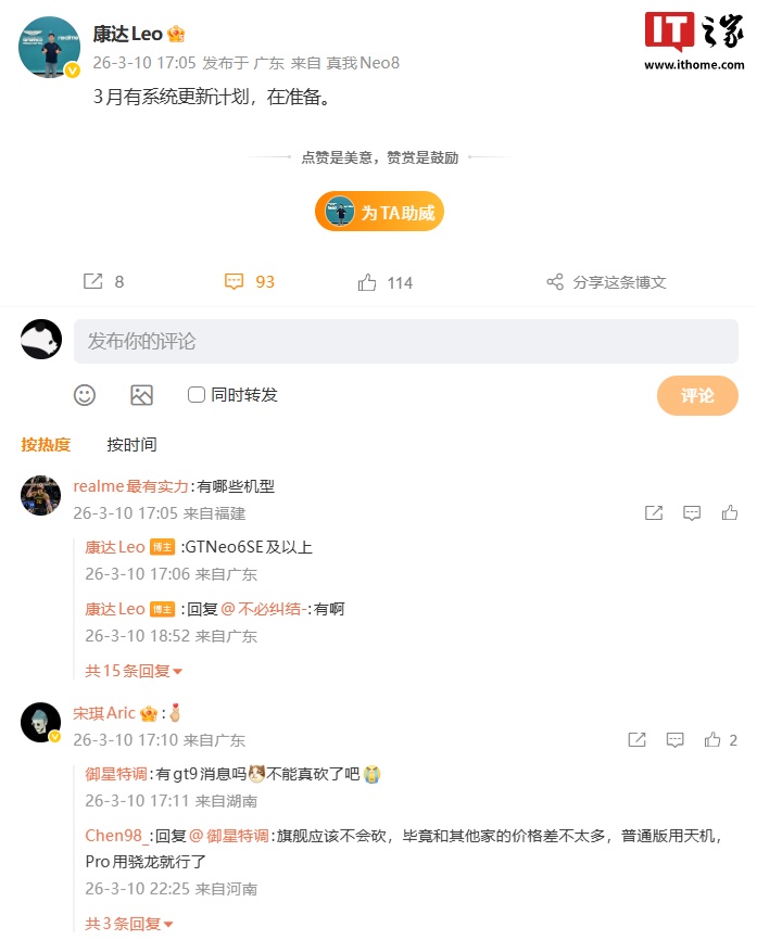 IT之家 3 月 10 日消息,realme UI 产品经理 @康达Leo 今日宣布,realme UI 系统在 3 月有更新计划,正在准备中。