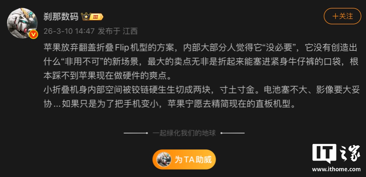 IT之家 3 月 11 日消息,博主 @刹那数码发文,透露苹果放弃了翻盖小折叠 Flip 机型的方案,这是因为内部大部分人觉得它“没必要”,它没有创造出什么“非用不可”的新场景,最大的卖点无非是折起来能塞进紧身牛仔裤的口袋,“根本踩不到苹果现在做硬件的爽点”。