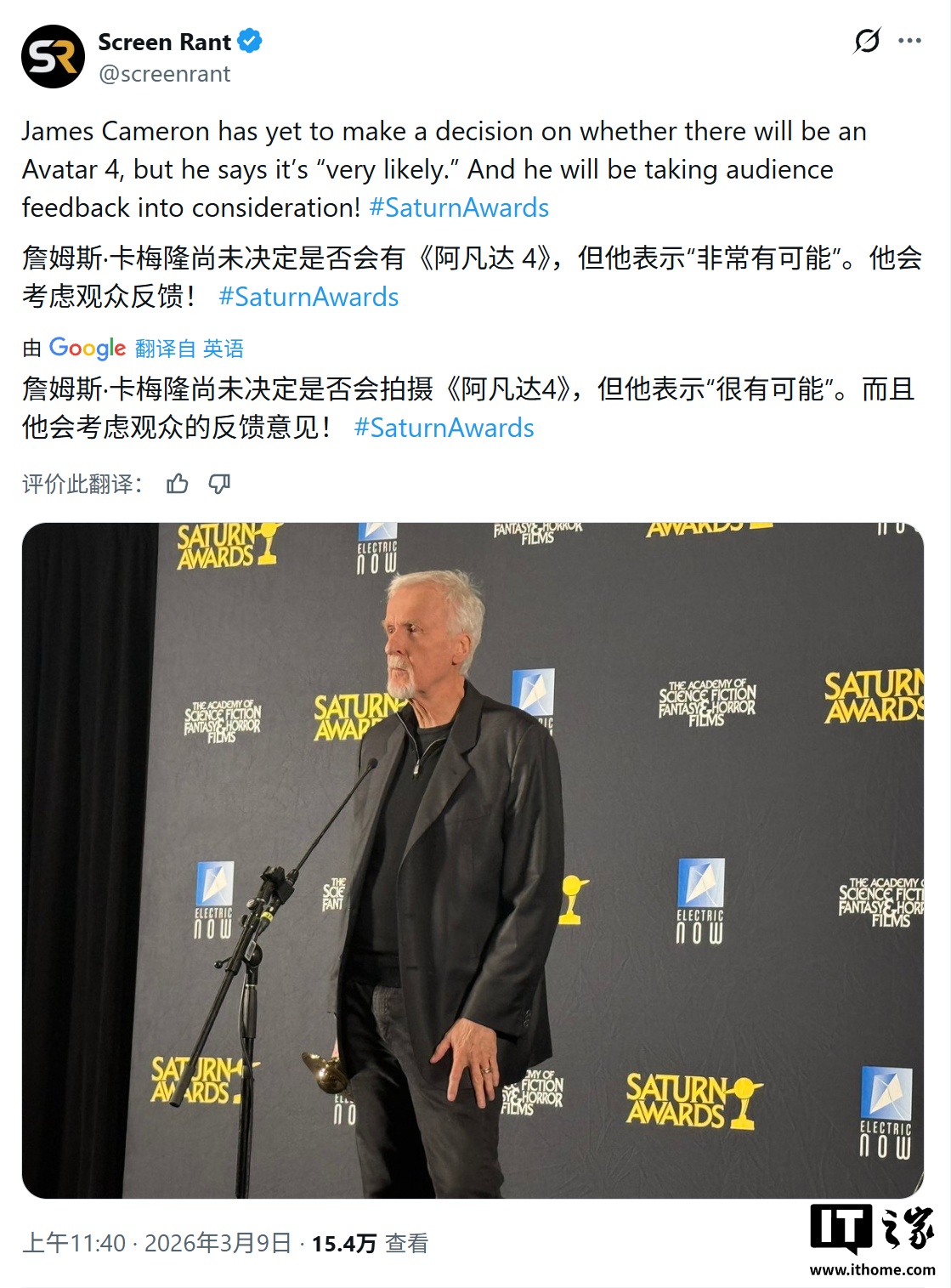 IT之家 3 月 11 日消息,科技媒体 Golem 昨日(3 月 10 日)发布博文,报道称在土星奖(Saturn Awards)上,詹姆斯 · 卡梅隆表示,尽管《阿凡达:火与烬》(Avatar: Fire and Ash)的票房表现未达预期,但他对拍摄第四部作品持乐观态度。