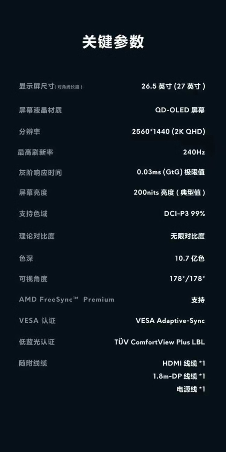 这款显示器采用了 QD-OLED 面板,支持 2560*1440 分辨率、240Hz 刷新率、200nits 亮度,号称无限对比度,支持 99% DCI-P3 色域,拥有 0.03ms GTG 响应时间,支持 AMD FreeSync Premium 技术,并经过 VESA Adaptive-Sync 自适应同步认证,通过莱茵 TÜV 三星「锐视认证」。
