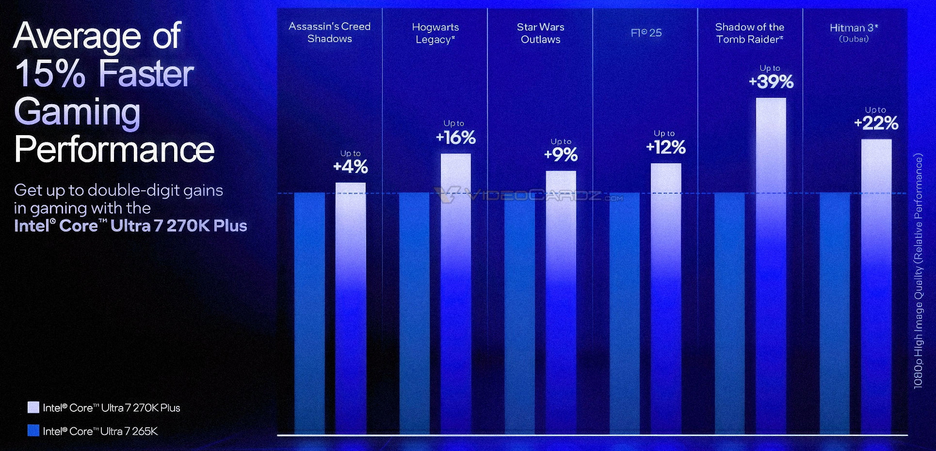 所有新处理器均配备了额外的能效核(E 核)、D2D 片上互连频率提升了 900Hz、原生内存支持也提升到了 7200MT/s。这些多方面因素优化了游戏表现,酷睿 Ultra 7 270K Plus、酷睿 Ultra 5 250K Plus 的平均游戏表现分别提升了 15% 和 13%。