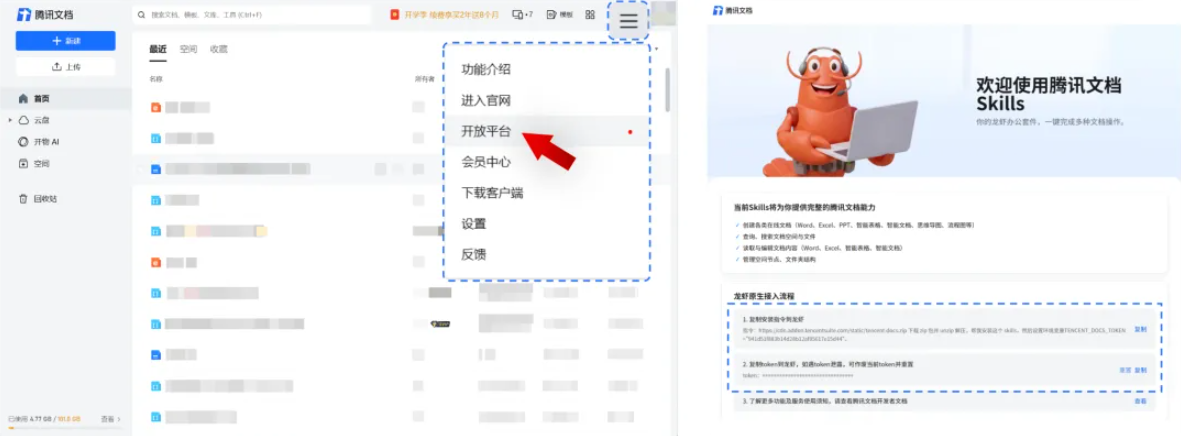 02、在腾讯文档列表页-点击右上角「更多操作-开放平台」,进入龙虾专用入口,获取安装指令及 token。
