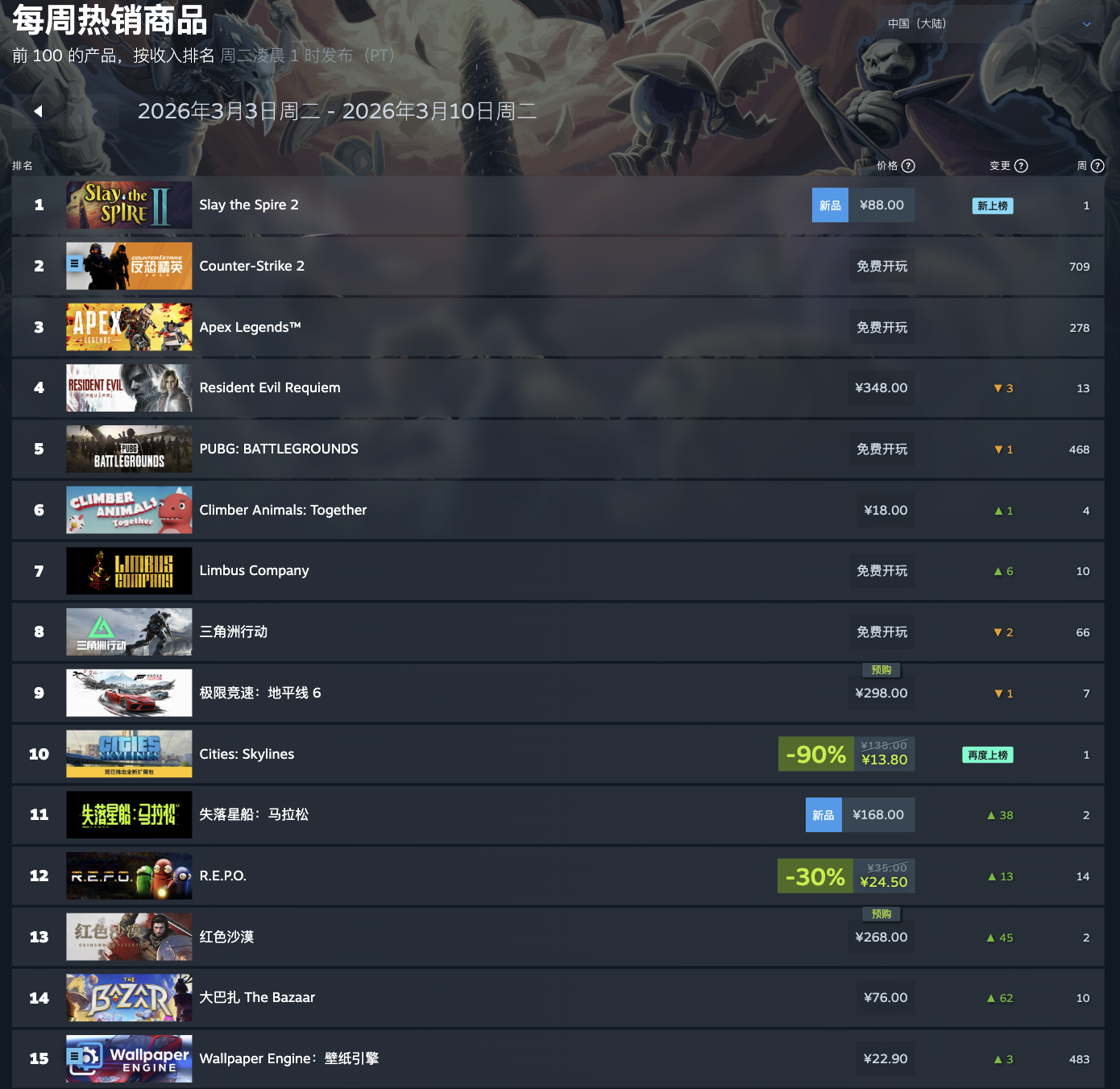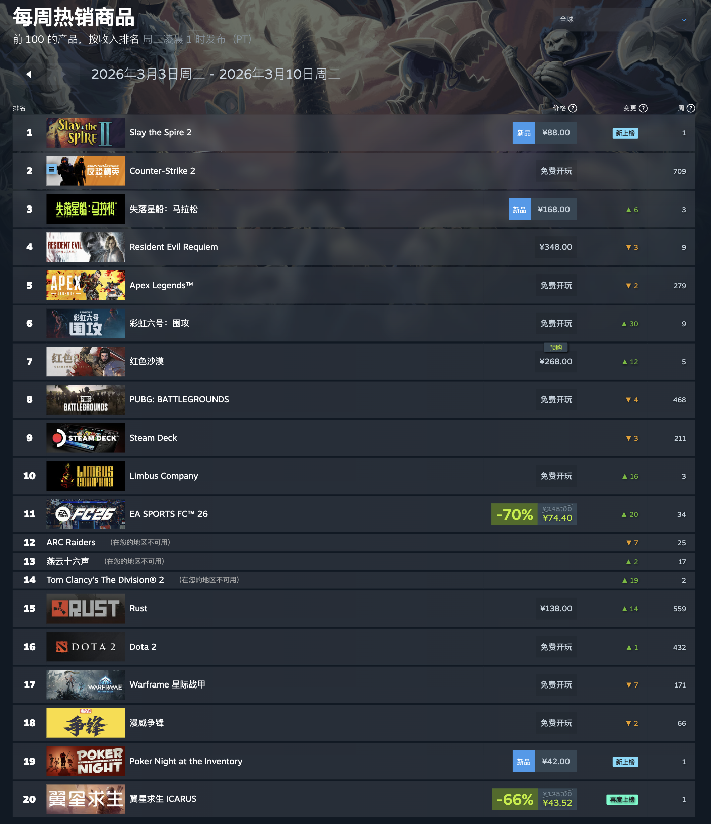 IT之家 3 月 12 日消息,Steam 现已公布了最新一周游戏销量排行榜(2026 年 3 月 3 日-2026 年 3 月 10 日,无免费游戏),伴随着《杀戮尖塔 2》于 3 月 6 日开启抢先体验,本作成功在全球区及国区超越《生化危机:安魂曲》,成为销量榜第一。