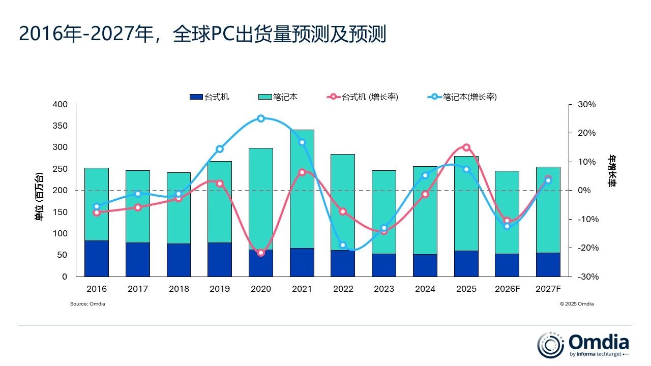 IT之家 3 月 12 日消息,Omdia 昨日最新预测,2026 年全球台式机、笔记本及工作站出货量预计下降 12%,至 2.45 亿台。这一预测基于内存与存储价格的急剧上涨 —— 特别是预计 2026 年第一季度将至少上涨 60%。
