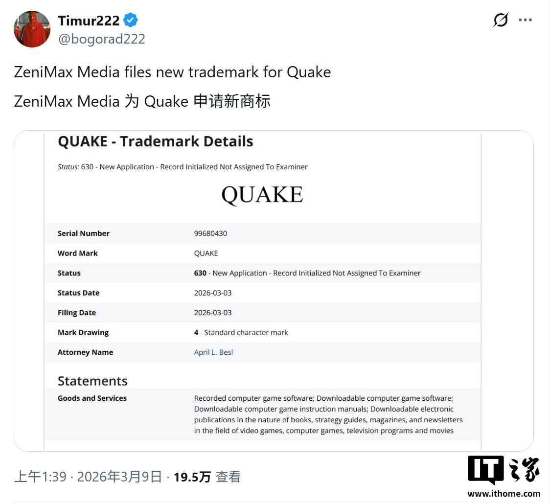 IT之家 3 月 12 日消息,消息源 Timur222 于 3 月 9 日在 X 平台发布推文,爆料称 ZeniMax(id Software 母公司)于 3 月 3 日提交了全新的《雷神之锤》(Quake)商标申请,目前该申请正等待审批。